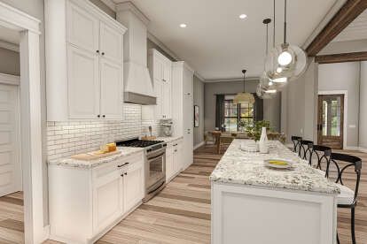 The centrally located kitchen flows naturally into the dining area and great room, creating an open layout ideal for both daily living and entertaining. 11 A large kitchen island adds prep space and casual seating, while ample cabinetry and counter space keep everything you need within easy reach. 12 The dining area’s placement makes it easy to transition from indoor meals to outdoor dining on the porch. 13