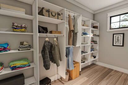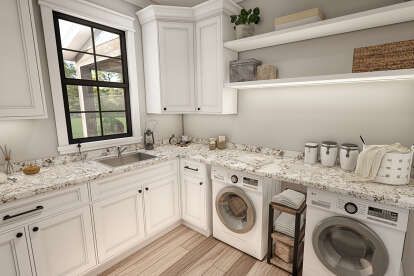 A dedicated mudroom just off the garage entry helps keep daily clutter under control by providing space for coats, shoes, backpacks, and gear. 20 A half bathroom conveniently located near the entry serves guests while maintaining privacy in the bedroom zones. 21 The laundry room is positioned for utility and accessibility, making everyday chores easier without interrupting main living areas. 22
