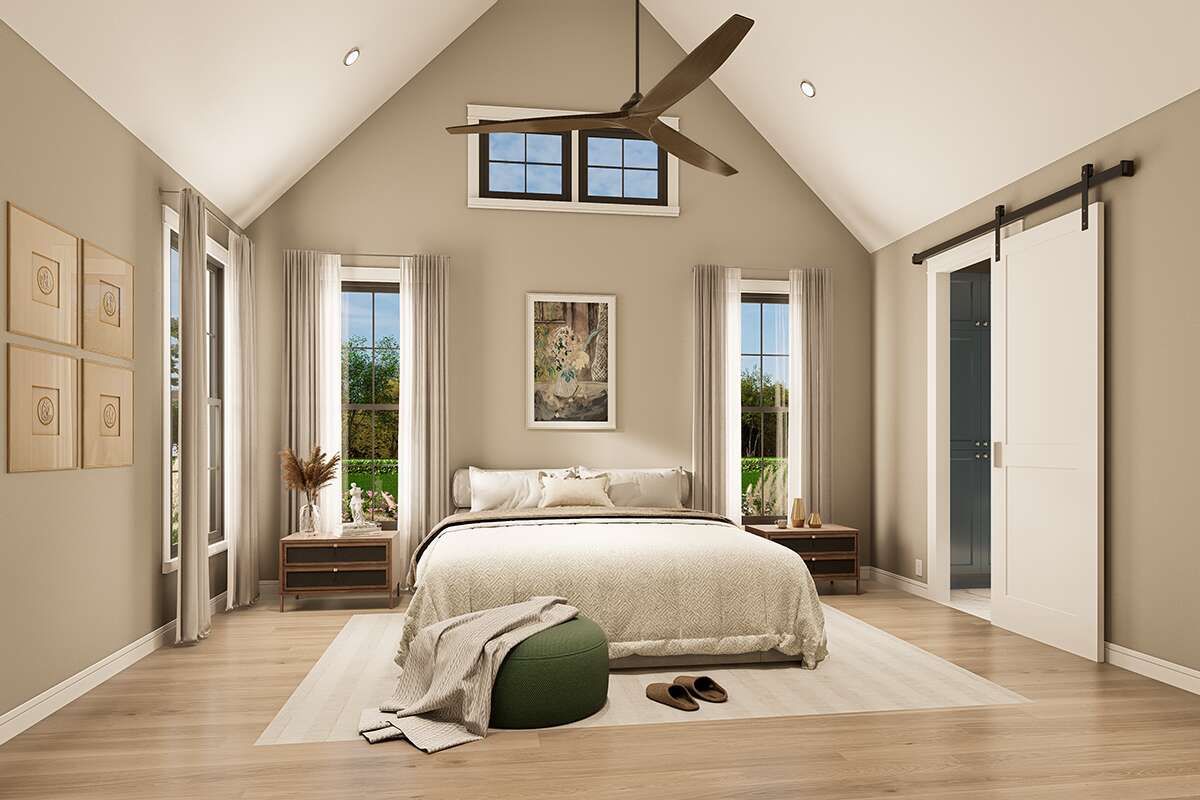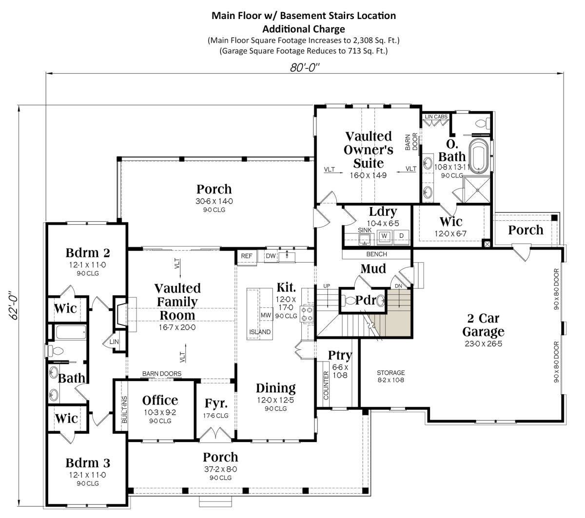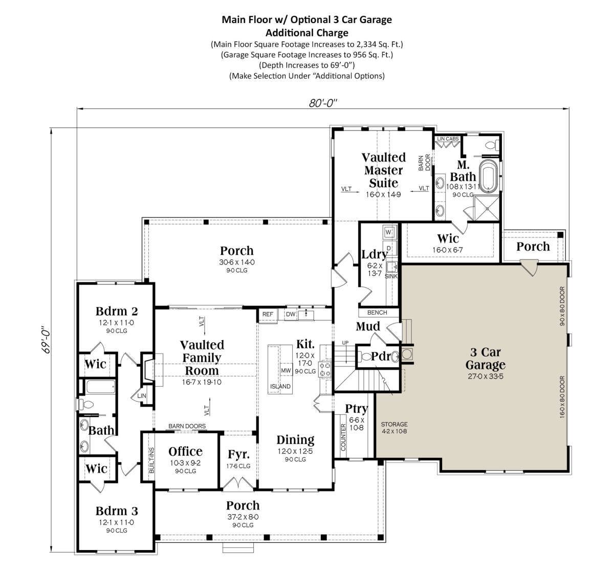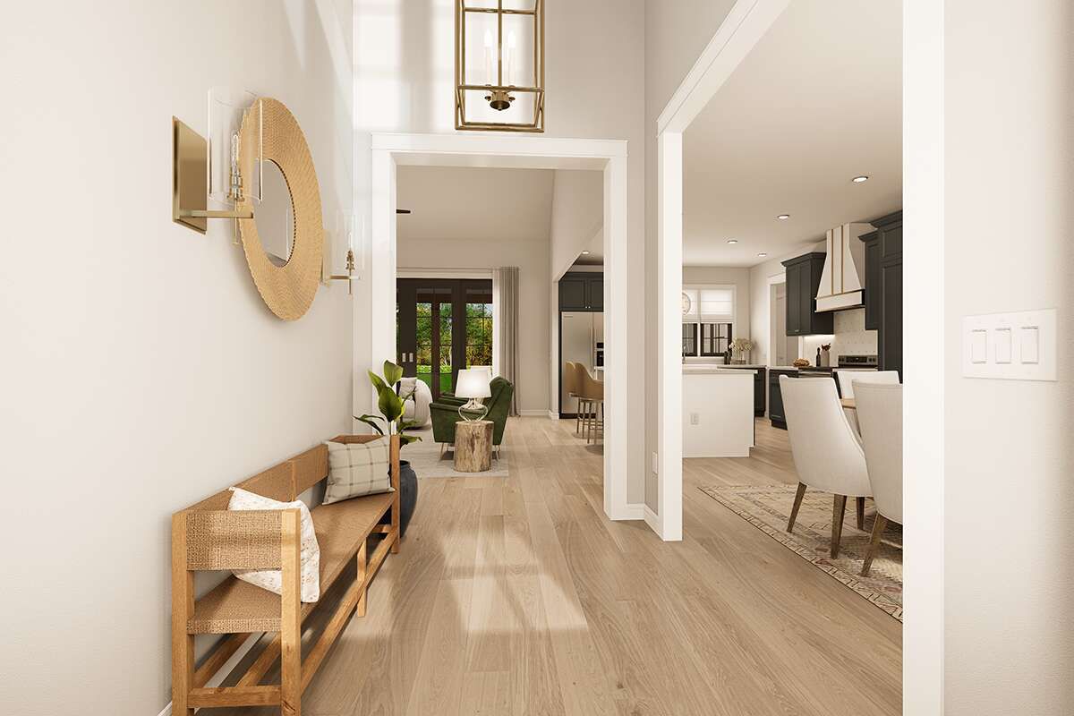 The exterior showcases the signature modern farmhouse aesthetic: crisp, clean lines, balanced proportions, and a range of porch spaces that create a warm and welcoming façade. 1 A covered front porch invites you into the home and provides a relaxed space to enjoy morning coffee or evening breezes, reinforcing the plan’s timeless charm and everyday comfort. 2This home sits on a footprint roughly 80′ wide × 62′ deep, giving it a grounded and spacious feel while still fitting well on typical suburban or countryside lots. 3