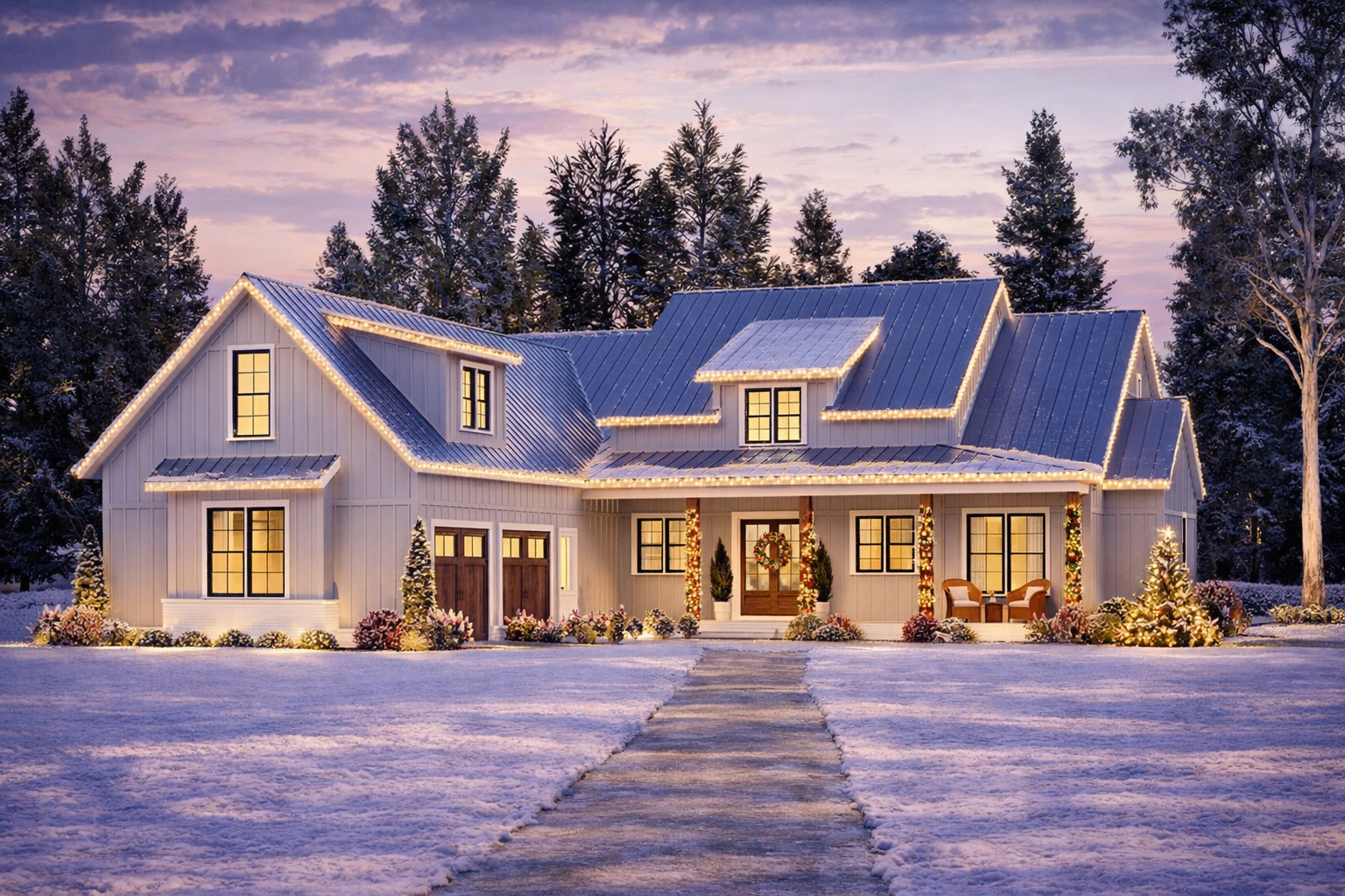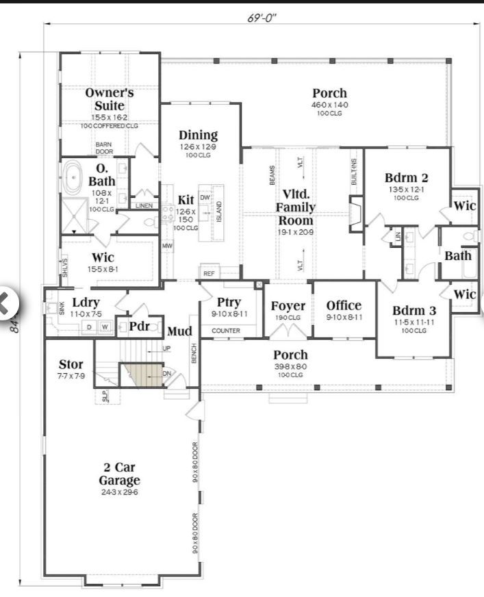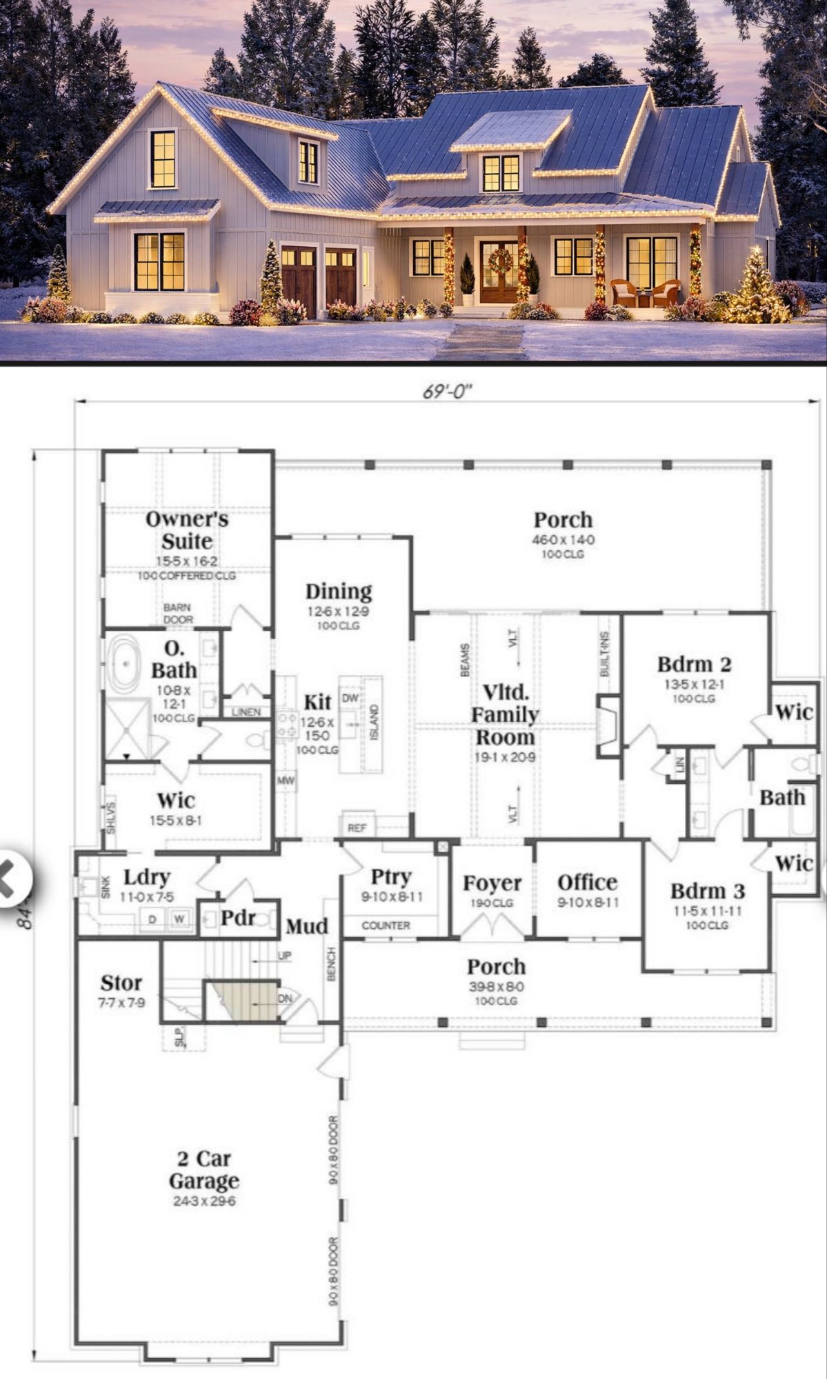 The exterior radiates timeless modern farmhouse style with a balanced façade, clean rooflines, and covered porch space that invites you to enjoy the outdoors. 1 A front porch welcomes guests while providing a perfect spot for morning coffee or evening calm. 2 At approximately 69′ wide × 84′ 6″ deep, the footprint presents strong presence without feeling overwhelming, fitting comfortably on typical suburban or rural lots. 3