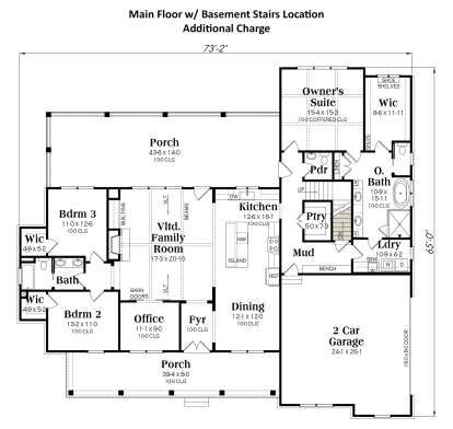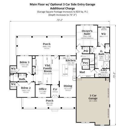 The exterior embraces classic farmhouse charm with clean lines, board-and-batten siding, and an inviting covered front porch that instantly feels like home. 1 With overall dimensions of about 73′ 2″ wide × 65′ deep, this design balances presence and proportion, fitting well on a variety of residential lots. 2 The side-entry garage keeps the front façade uncluttered, enhancing the welcoming, refined look that suits both rural and suburban settings. 3