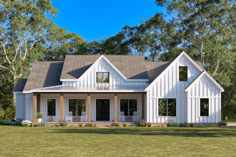 This modern farmhouse design harmonizes classic farmhouse charm with contemporary functionality. Its open living spaces, generous porch areas, flexible bedroom options, and thoughtful daily features make it ideal for both relaxed everyday life and lively entertaining. Whether you’re gathering at the kitchen island or enjoying quiet moments on the covered porch, this home offers comfort, flow, and timeless appeal. 36