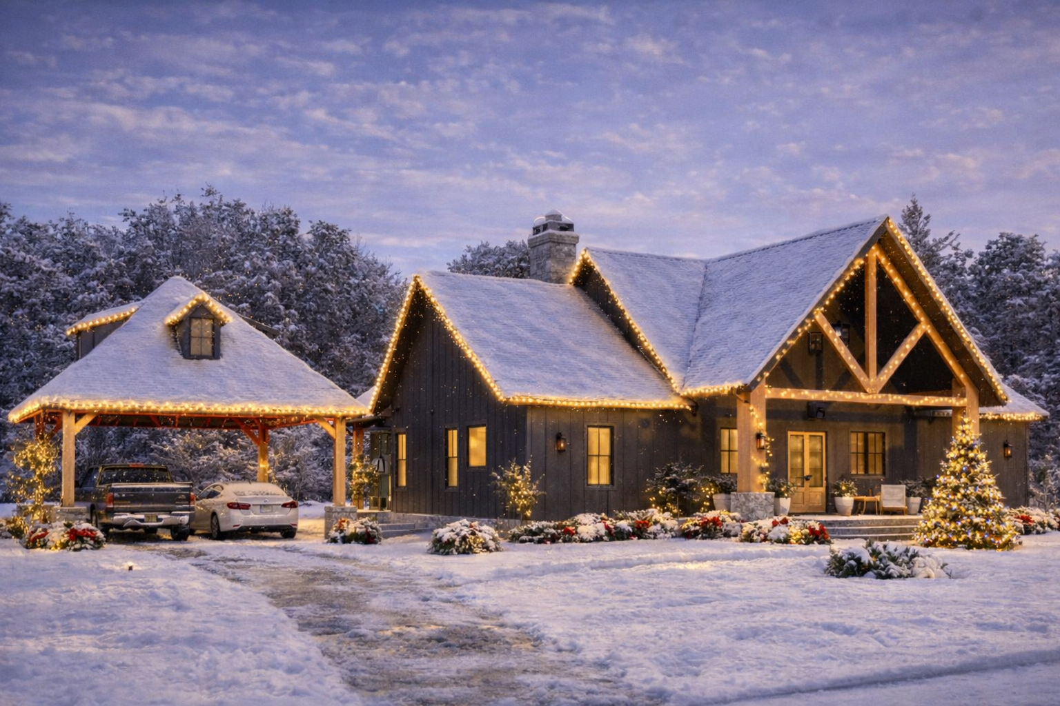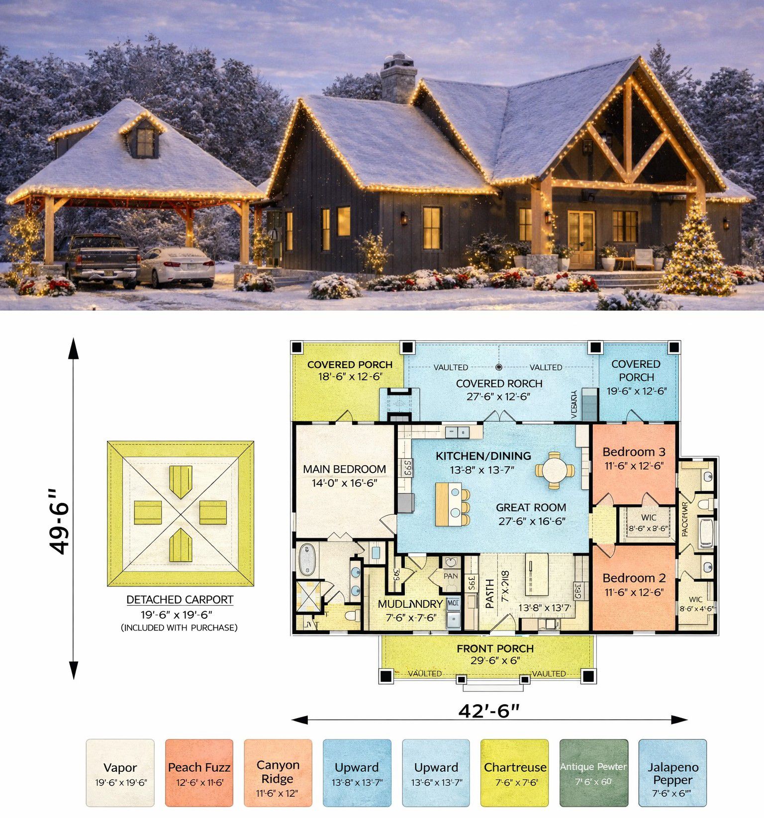 The exterior combines timeless farmhouse details with modern clean lines. 1 With a footprint approximately 62′-11″ wide × 51′-5″ deep, the home presents a welcoming presence on the street without overwhelming a medium-sized lot. 2 A covered front porch sets the tone, offering a warm and relaxing entry that’s perfect for rocking chairs, potted flowers, or morning coffee. 3