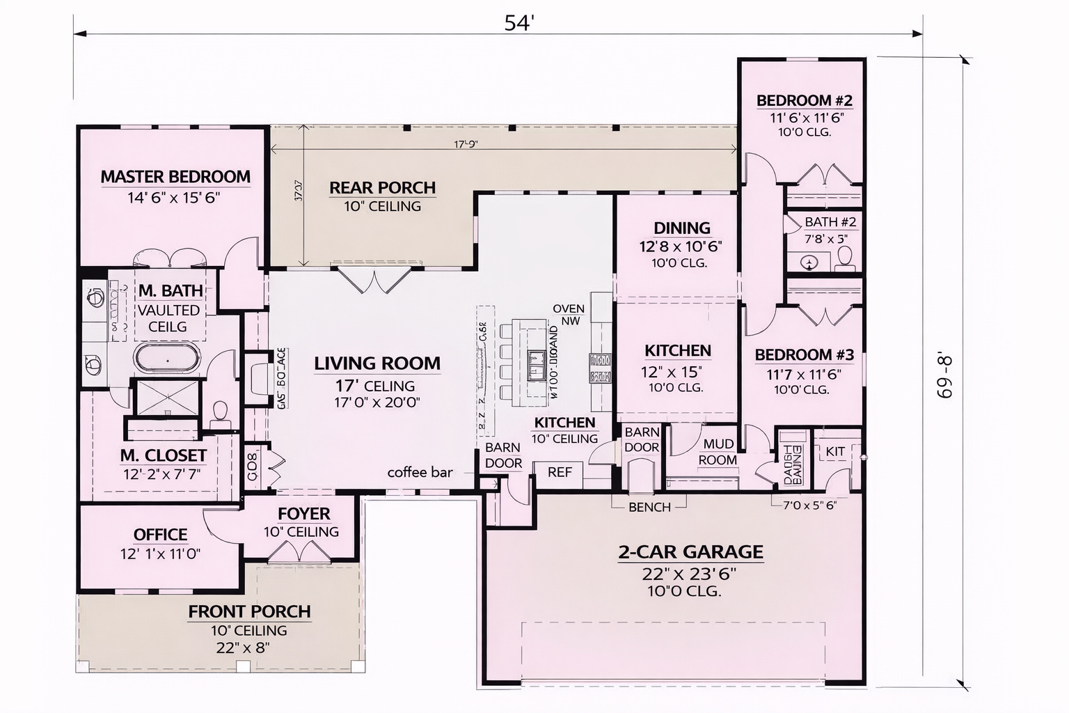 The exterior showcases classic modern farmhouse appeal with clean lines, balanced proportions, and a welcoming covered front porch. Its symmetrical façade and generous windows create a bright, inviting look that’s at home in both countryside settings and suburban lots. 1 The plan’s width (~54′) and depth (~69′-8″) give it a grounded presence without feeling bulky, making it versatile for many different property types. 2