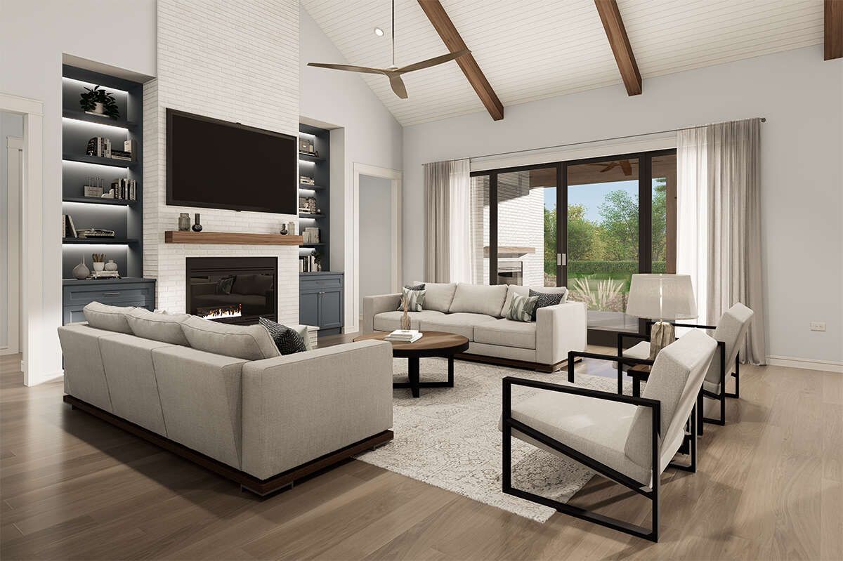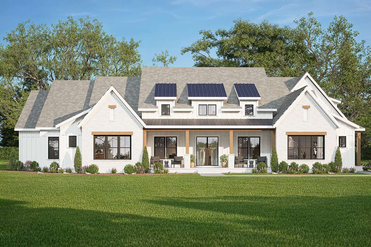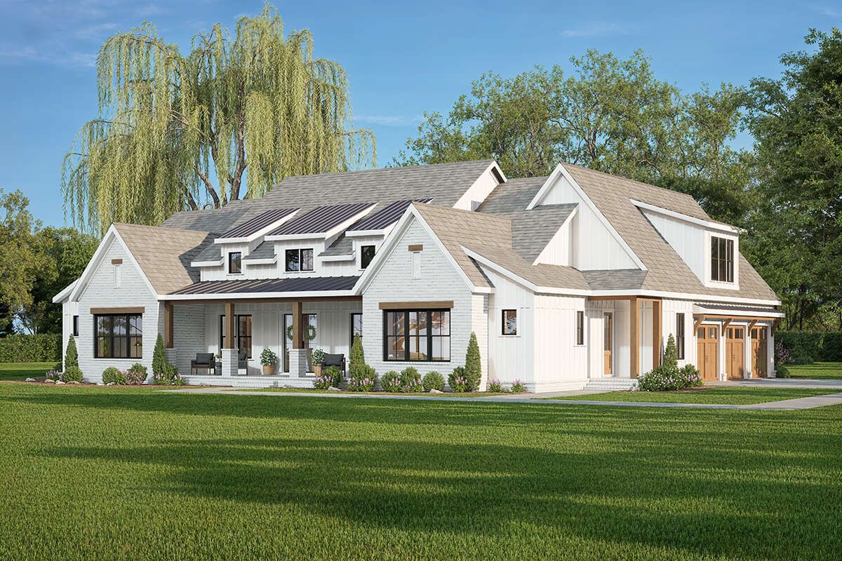 This beautiful modern farmhouse plan spans about 3,486 sq ft and brings together sophistication, practicality, and plenty of space for daily living and entertaining. With a flexible layout that can support 4 to 5 bedrooms, 4 full bathrooms, 1 half bathroom, and an attached 3-car garage, it’s ideal for families who want a home designed to balance privacy, social spaces, and effortless indoor-outdoor living. 0