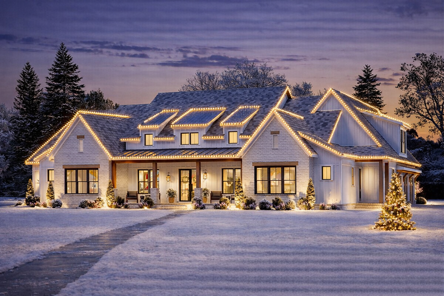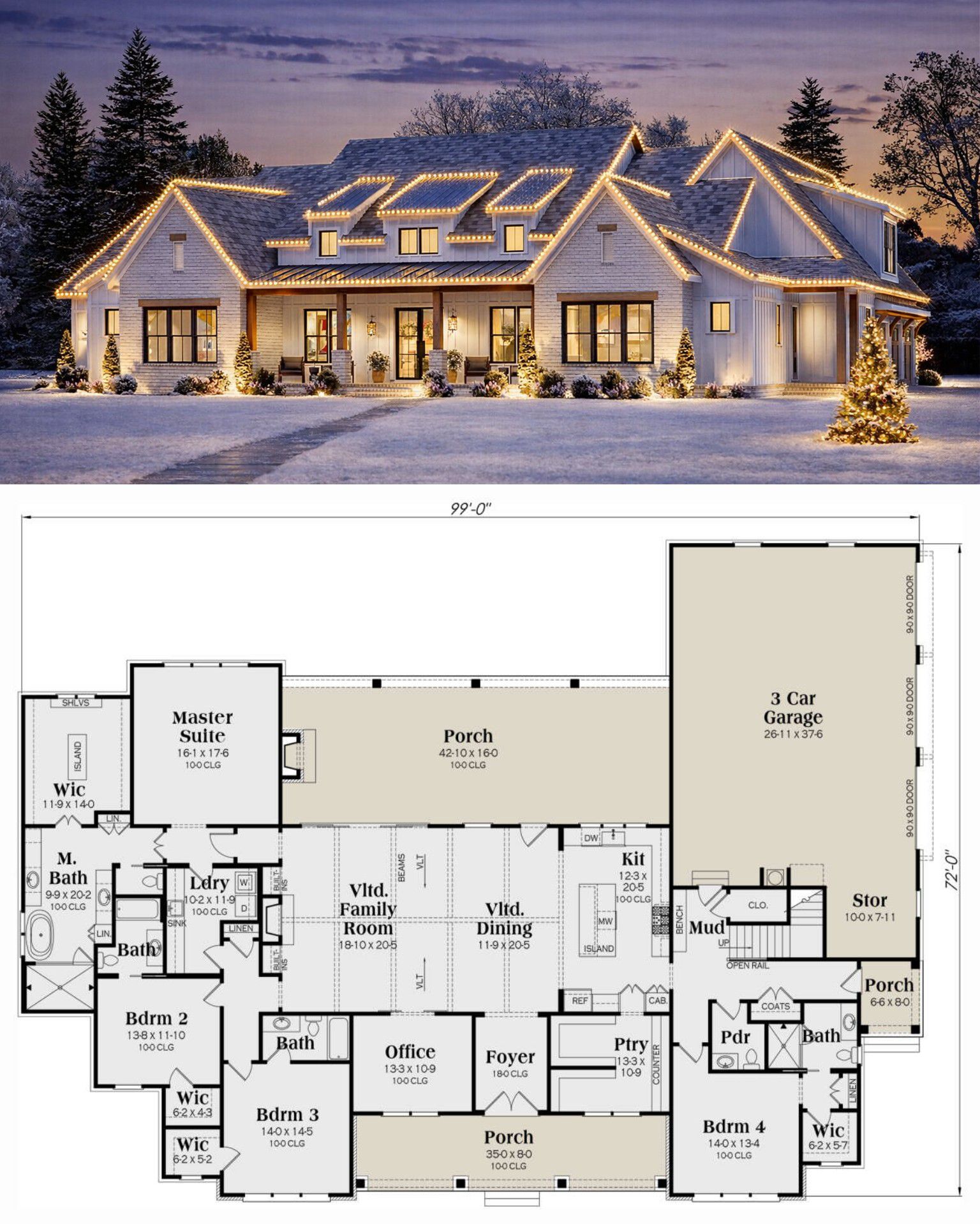This modern farmhouse greets you with timeless style — crisp vertical siding, balanced rooflines, and a generous covered front porch that sets a warm, welcoming tone. 1 The façade beautifully blends classic farmhouse charm with contemporary detailing, creating a presence that feels both grounded and refined. 2 Measuring approximately 99′ wide × 72′ deep, this home sits comfortably on larger lots while leaving plenty of room for landscaping, gardens, or outdoor gathering spaces. 3
