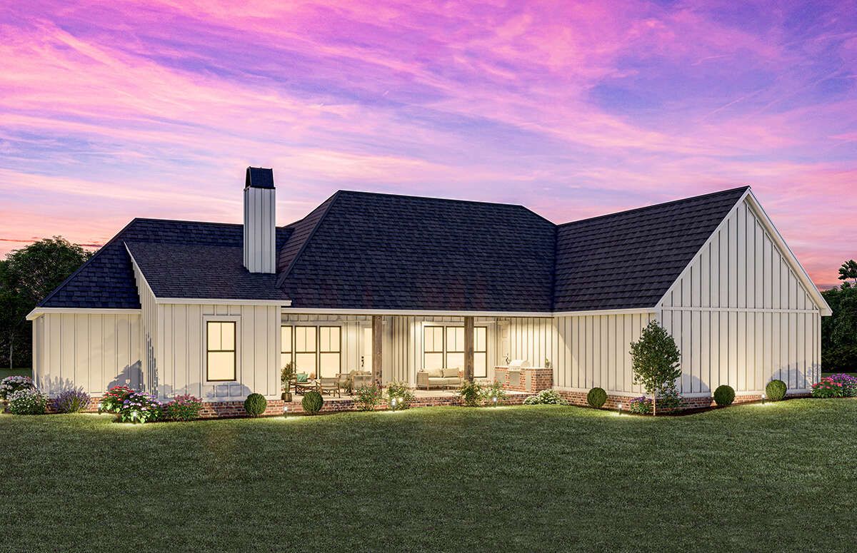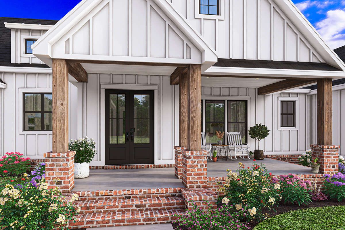 The exterior captures timeless farmhouse charm paired with modern lines and balanced proportions. 1 A covered front porch invites comfortable outdoor seating, while crisp siding and thoughtful architectural details create a look that’s both classic and contemporary. 2 At about 80′-7″ wide × 71′-7″ deep, the footprint gives this home a grounded yet substantial presence that works beautifully on a variety of sites. 3