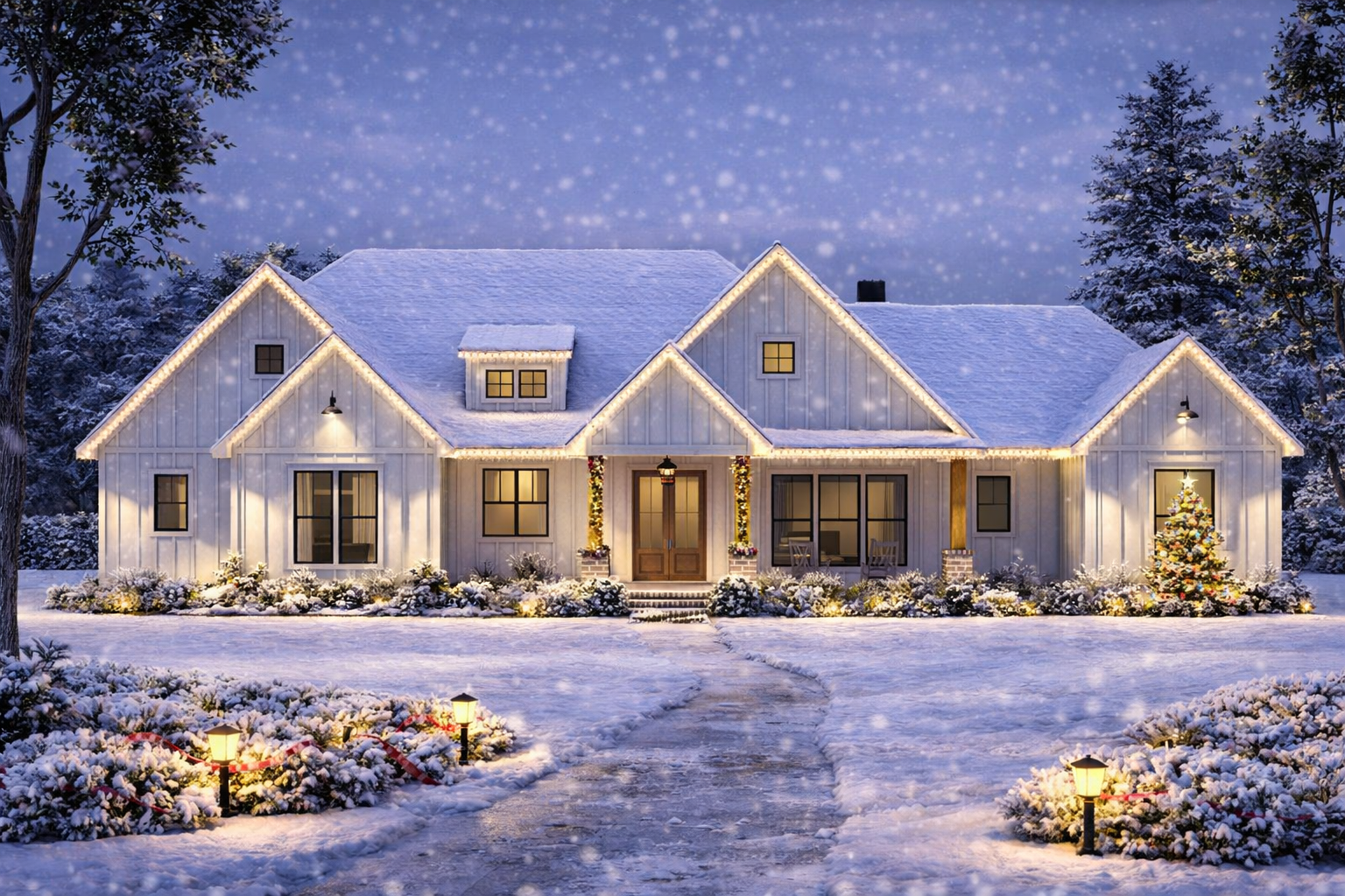 The exterior captures timeless farmhouse charm paired with modern lines and balanced proportions. 1 A covered front porch invites comfortable outdoor seating, while crisp siding and thoughtful architectural details create a look that’s both classic and contemporary. 2 At about 80′-7″ wide × 71′-7″ deep, the footprint gives this home a grounded yet substantial presence that works beautifully on a variety of sites. 3