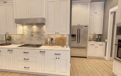 The kitchen supports both daily routines and entertaining with ease. Ample countertops and cabinetry provide plenty of storage and work surface, while a large central island offers additional prep space and casual seating. Whether it’s meal prep, kids’ homework, or casual chatting over coffee, this kitchen becomes a natural hub for activity.