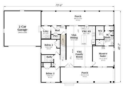 The exterior boasts a welcoming modern farmhouse façade — clean lines, balanced proportions, and a generous covered front porch that beckons you in. 1 With overall dimensions of approximately 73′ 6″ wide × 48′ 2″ deep, this home presents pleasing curb appeal and a footprint that fits comfortably on a variety of lot sizes. 2 Practical board-and-batten siding and accents silently nod to authentic farmhouse roots while keeping the design fresh and contemporary. 3