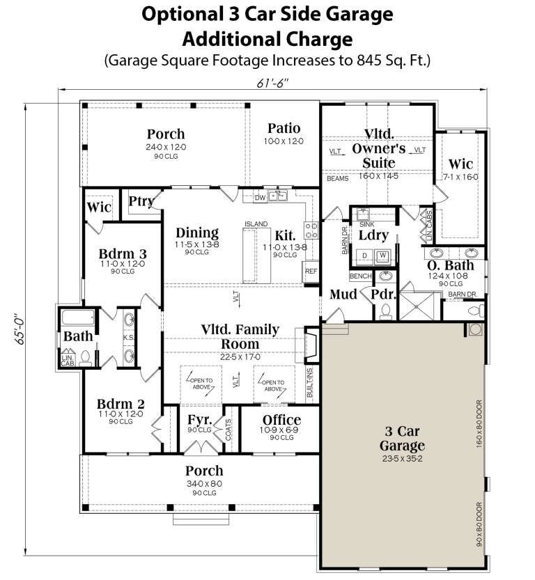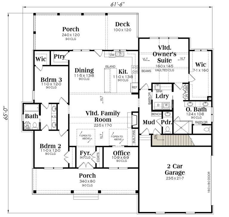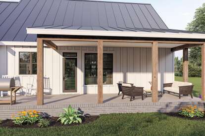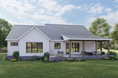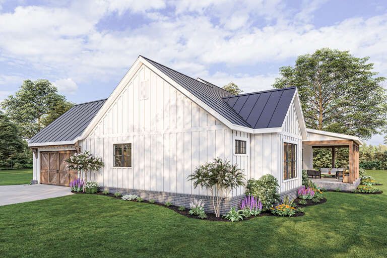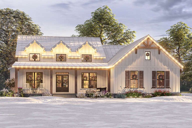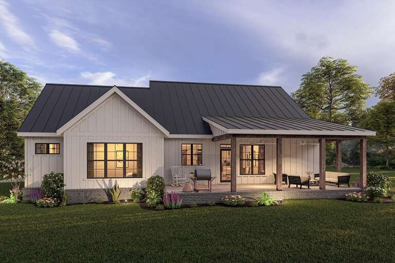 The exterior offers classic modern farmhouse charm with clean architectural lines, board-and-batten accents, and a covered front porch that invites you indoors with warmth. 1 The covered rear porch adds to the home’s outdoor living potential, creating a space for relaxed meals, lingering evenings, and connection to fresh air and nature. 2 At about 61′ 6″ wide × 65′ deep, the footprint fits well on a range of lot sizes while still making a handsome, balanced street presence. 3