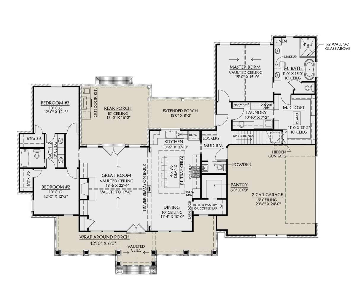 This modern farmhouse plan blends classic curb appeal with thoughtful functionality and flexible spaces. Its open common areas encourage connection, while private bedroom wings create quiet retreats. With generous porch living and everyday conveniences like a mudroom and accessible powder room, this design supports both relaxed family living and memorable gatherings. 32