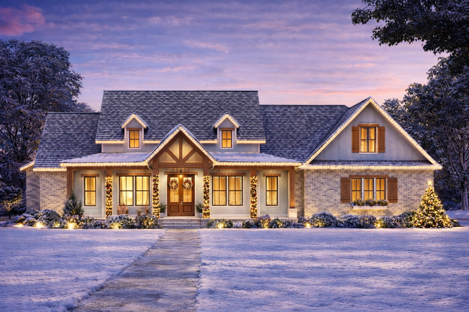 The exterior mixes traditional farmhouse warmth with modern materials and proportions. 1 A wide, covered wrap-around front porch with a vaulted central section creates a welcoming entry and relaxed outdoor living space — ideal for rocking chairs, morning coffee, or greeting visitors. 2 Large windows and decorative details enhance the façade, giving the home strong curb appeal without being overly ornate. 3