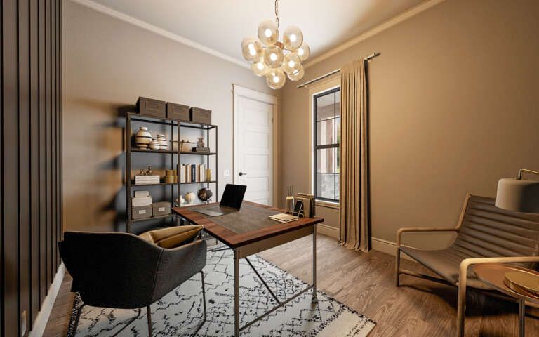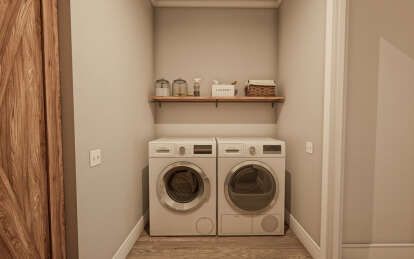 A dedicated laundry room helps keep household chores organized and out of main living areas. Storage is integrated thoughtfully throughout the plan—from closets in private suites to shared storage near common areas—helping maintain a tidy, clutter-free environment.