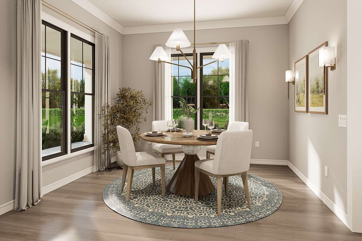 The dining space sits comfortably between the kitchen and family room—perfectly positioned for both casual meals and more formal gatherings. Its proximity to the kitchen and living areas supports an intuitive flow that keeps conversations and experiences connected, whether you’re serving weekday dinners or hosting holiday celebrations.