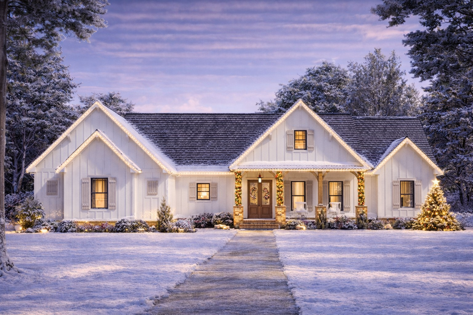 The exterior captures classic modern farmhouse character with clean lines, balanced proportions, and a covered front porch that immediately feels inviting. 1 A combination of siding textures and strategic window placement enhances visual interest while maintaining timeless appeal. 2 Whether set in a rural landscape or a suburban setting, this façade presents warm curb appeal and a sense of welcoming from the moment you arrive. 3
