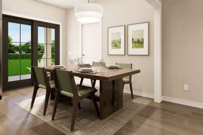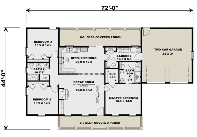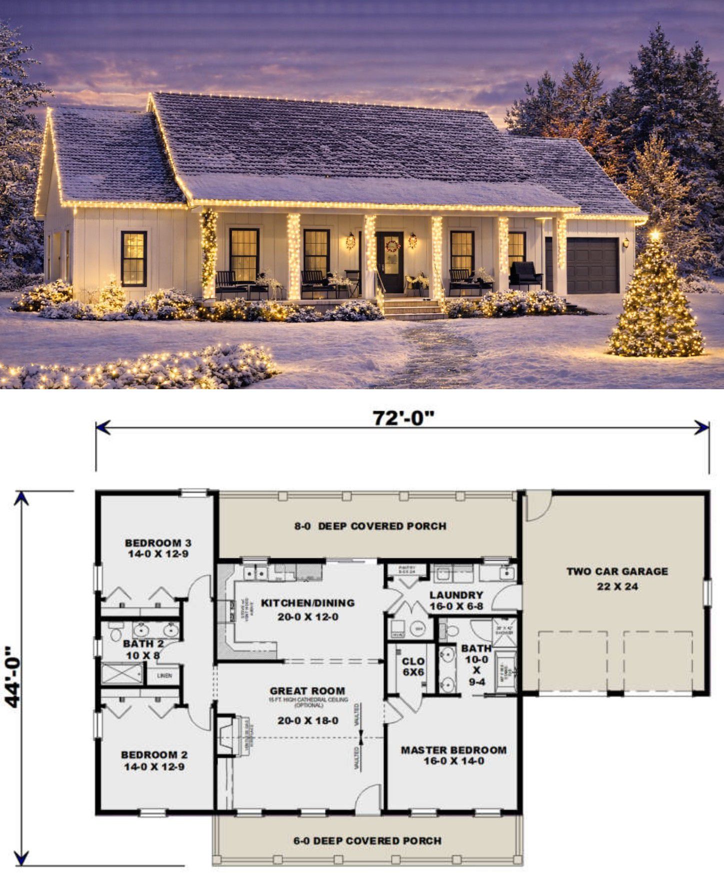 The exterior offers classic modern farmhouse character with balanced proportions and clean lines that feel both contemporary and welcoming. 1 At about 72′ wide × 44′ deep, the plan is well-scaled for a variety of lots while presenting a strong street presence. 2 Covered porch spaces at the front and rear enhance the home’s connection with the outdoors, inviting you to enjoy porch living year-round. 3