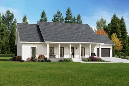 This modern farmhouse plan delivers about 1,615 sq ft of thoughtfully arranged living space designed for everyday comfort, connection, and style. With 3 bedrooms, 2 full bathrooms, and an attached 2-car garage (~528 sq ft), this single-story design blends classic farmhouse charm with practical flow — perfect for families, first-time homeowners, or anyone who loves versatile living with timeless appeal. 0