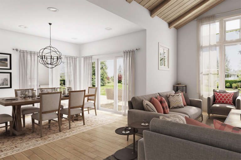 At the heart of this home is a vaulted great room that gives the interior a sense of expansiveness and light. 6 The open concept design integrates the great room, kitchen, and dining area into one shared zone — fostering a seamless flow between daily routines, family time, and entertaining. 7 Large windows frame outdoor views and draw sunlight deep into the home, making the space feel welcoming and warm without feeling expansive or overwhelming. 8