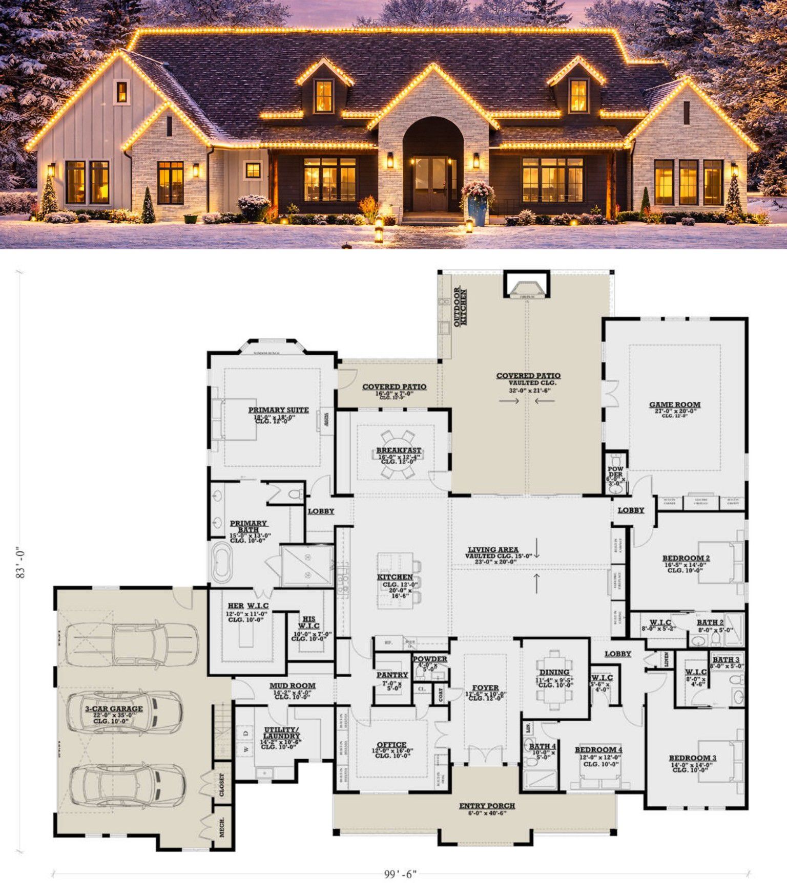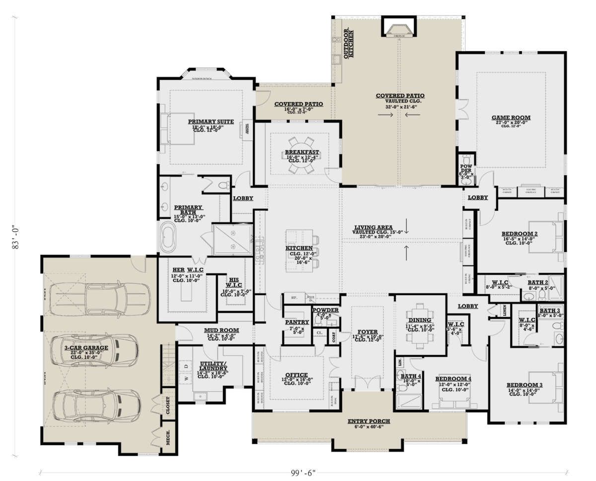 This impressive modern farmhouse plan offers about 4,187 sq ft of smart, luxury-oriented living space designed for today’s lifestyle. With 4 bedrooms, 5 bathrooms (including 2 half baths), a huge covered outdoor area, and a 3-car garage, this single-story design suits families who love open space, thoughtful detailing, and seamless indoor-outdoor living. 0