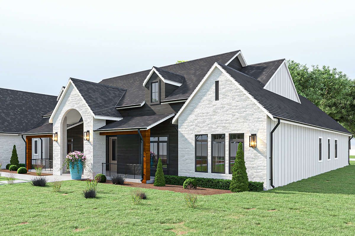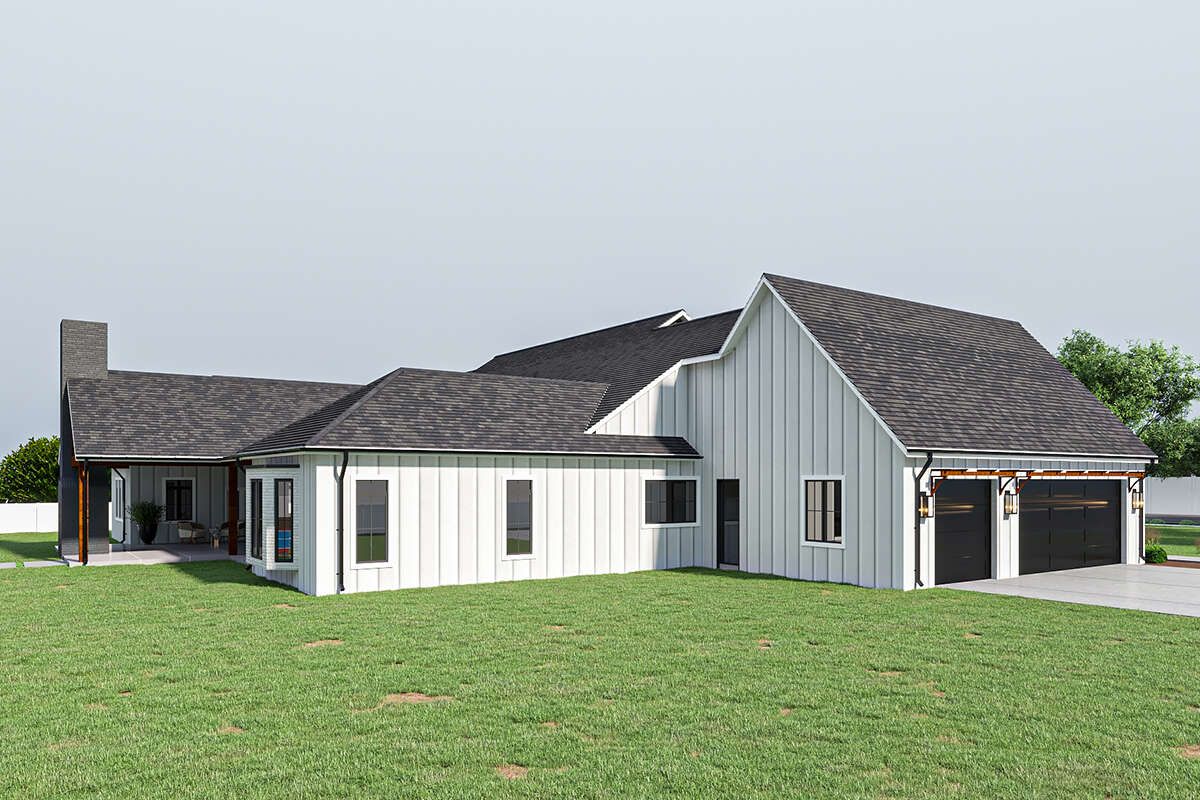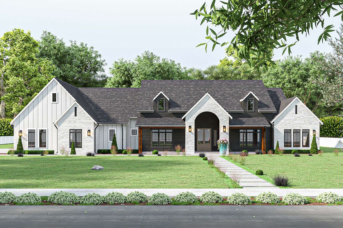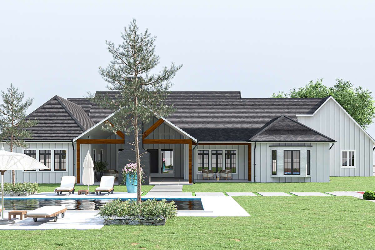 This modern farmhouse balances generous family living with practical functionality. Its expansive open interior, thoughtful bedroom placement, and covered outdoor areas create a home that’s both comfortable and stylish. Whether hosting gatherings or enjoying daily routines, this design offers plenty of space, privacy, and room to grow — a refined solution for contemporary farmhouse living.