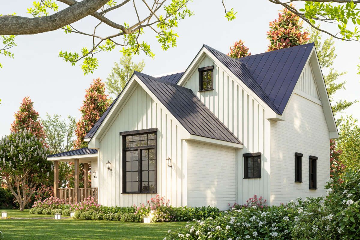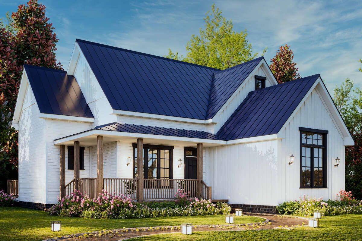The exterior is a refreshing modern farmhouse take on classic rural design. A covered front porch makes a welcoming first impression and extends your living space outdoors. 1 Simple yet thoughtful detailing on the façade keeps the look clean and timeless, while board-and-batten or horizontal siding options can add visual texture and warmth. 2 With a footprint of roughly 45′ 11″ wide × 50′ 10″ deep, this home feels well-proportioned without being too large or overwhelming for modest lots. 3