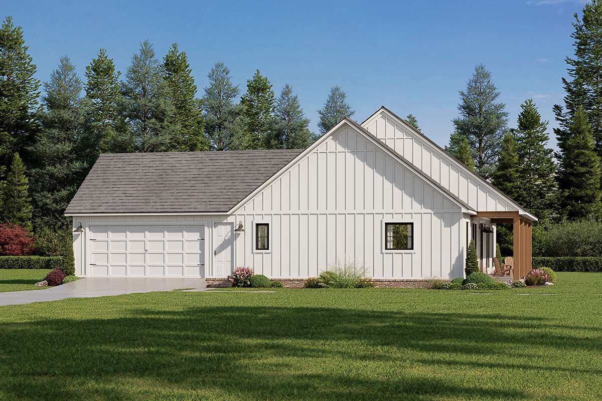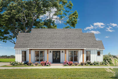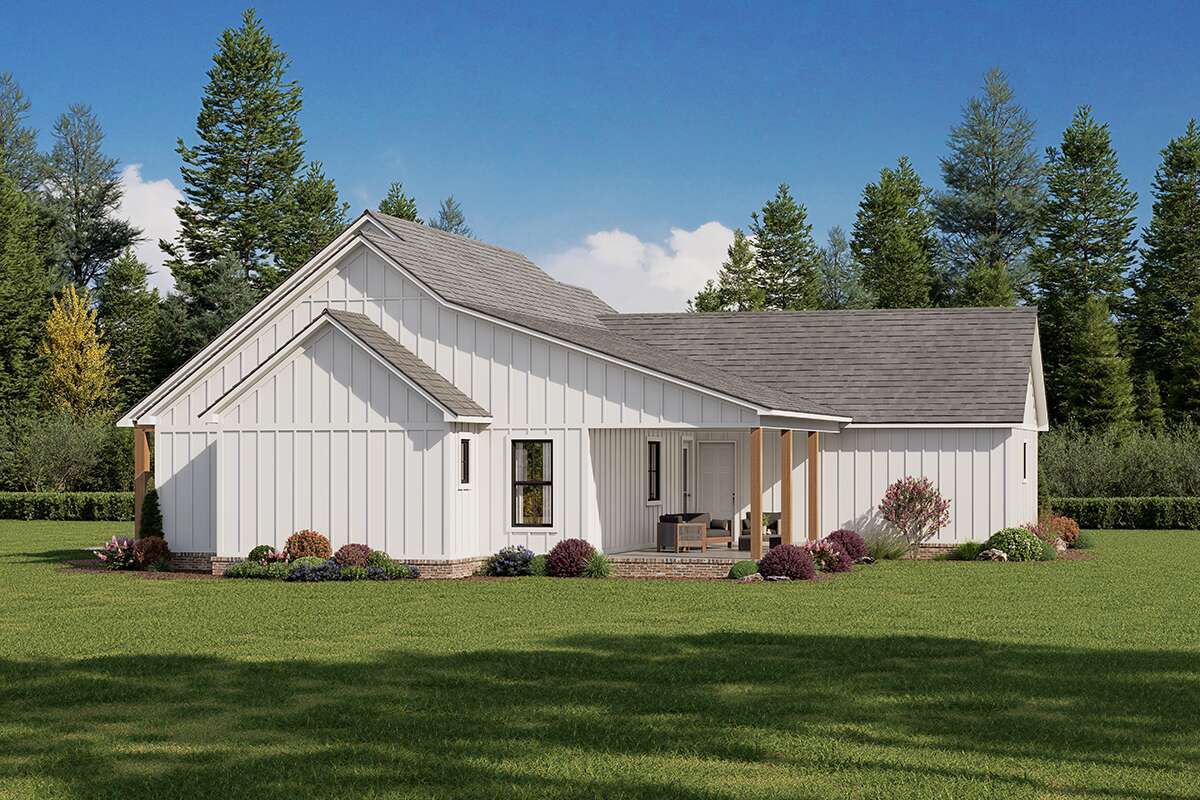 This modern farmhouse plan offers about 1,872 sq ft of inviting, single-story living space designed for comfort, flexibility, and everyday ease. With a thoughtful split-bedroom layout, 3 bedrooms plus a half bath, and an attached 2-car garage (~599 sq ft), this home blends open interior spaces with generous outdoor porch areas — ideal for relaxed family life, entertaining, or simply enjoying modern style with classic farmstead warmth. 0