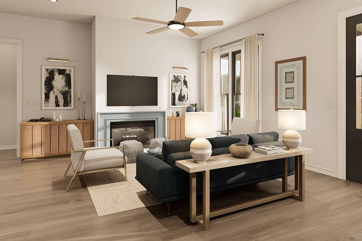 Stepping onto the covered front porch, you immediately feel the home’s relaxed, approachable spirit. 3 Whether you’re greeting guests or enjoying a quiet morning cup of coffee, this outdoor space invites casual comfort and extends your living space beyond the interior walls. 4 The porch also frames views into the great room and helps bring natural light into the home. 5
