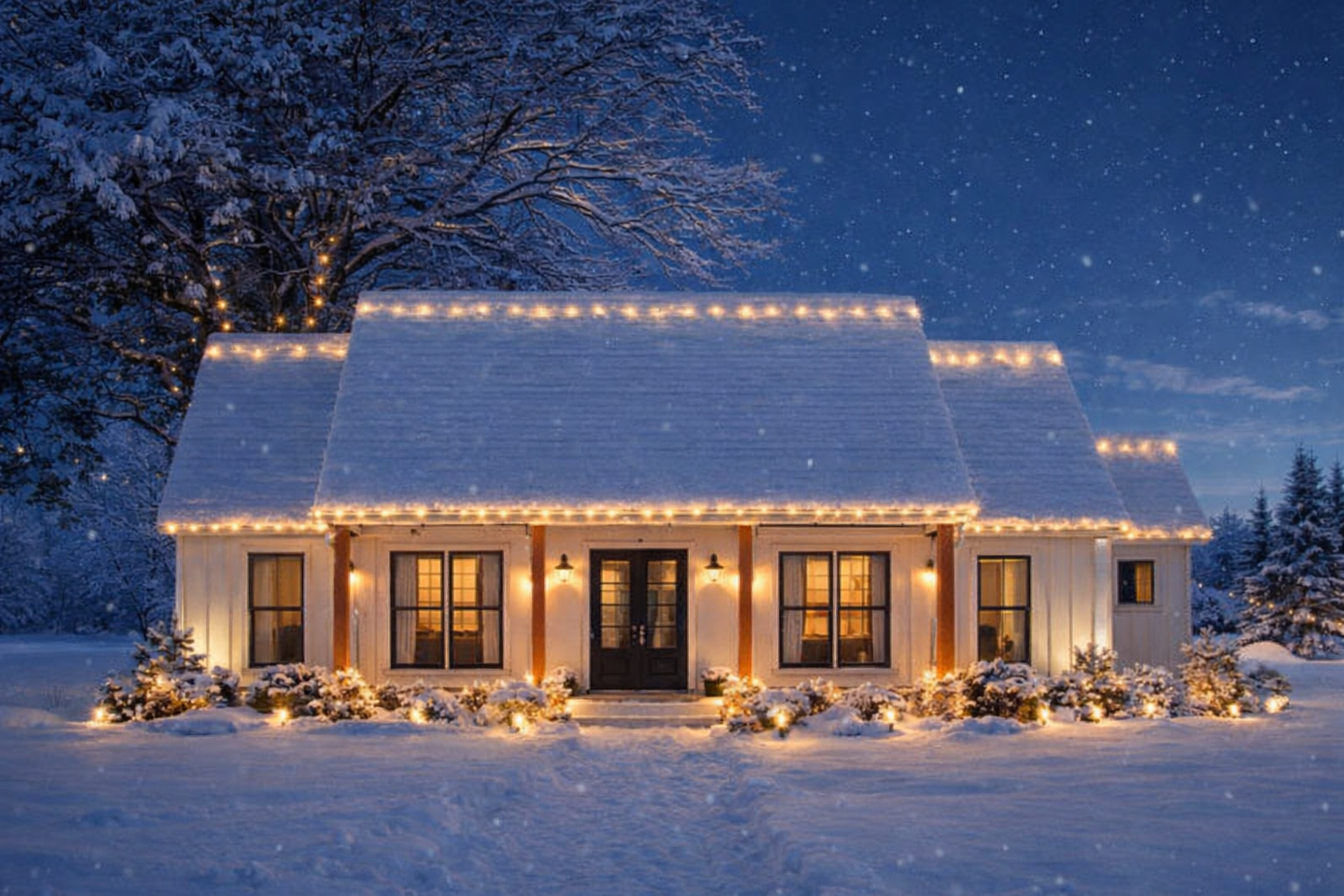 The exterior showcases timeless modern farmhouse character with clean rooflines, balanced proportions, and practical detailing. A covered front porch sets a welcoming tone, while complimentary rear porch space expands your outdoor living options and enhances the connection between indoors and out. 1 The home’s footprint of approximately 61′-1″ wide × 64′-6″ deep makes it well suited to a range of lot sizes without feeling oversized. 2