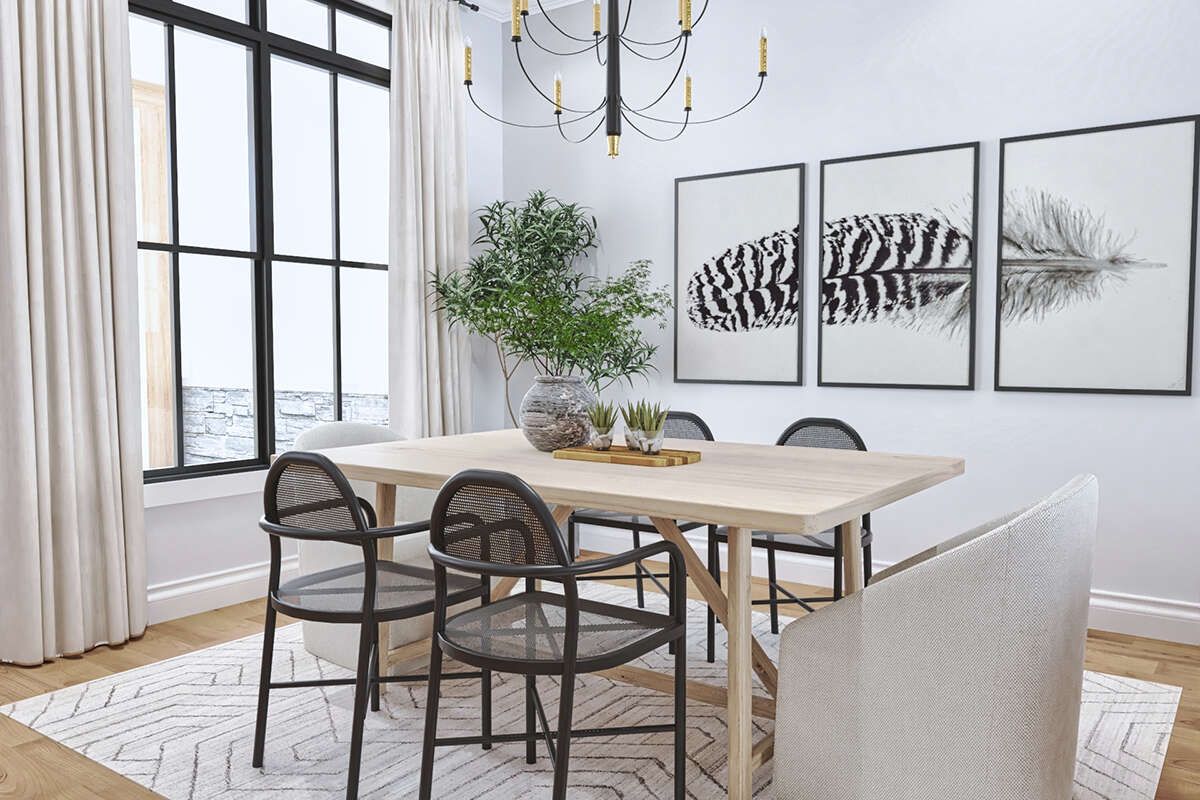 The kitchen balances practicality with social design. 9 Plenty of counter space and thoughtful storage help streamline meal prep, while an island offers casual seating and a central gathering spot. 10 Its easy access to dining and living zones makes hosting and daily life effortless, encouraging connection across the main areas. 11