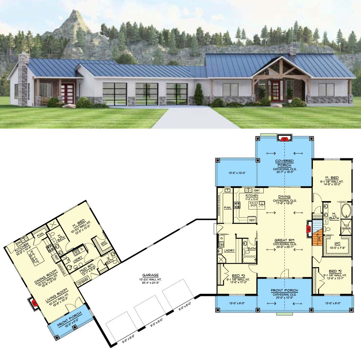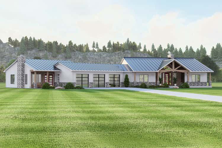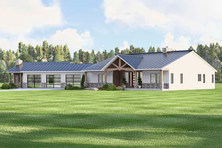 - Style / Layout Features: Modern farmhouse ranch, angled 3-car garage, split bedrooms, cathedral ceilings in main living areas, in-law suite / guest apartment, open-concept living, covered porches. 8