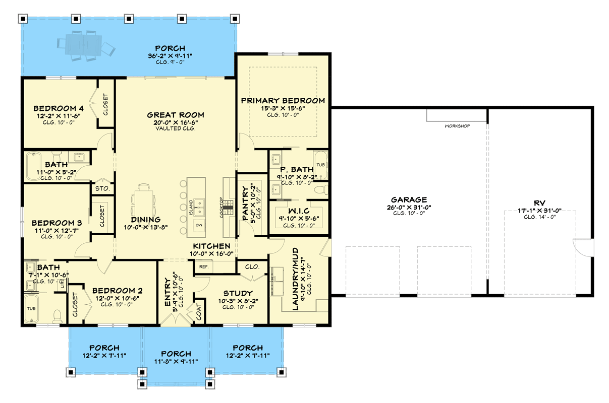 This modern farmhouse plan stands out by blending timeless farmhouse aesthetics with functional design — from split bedrooms and a spacious open living core to a massive garage with RV storage and workshop space. It’s a home that supports daily life, hobbies, and entertaining with equal ease, making it both practical and inviting for long-term living.