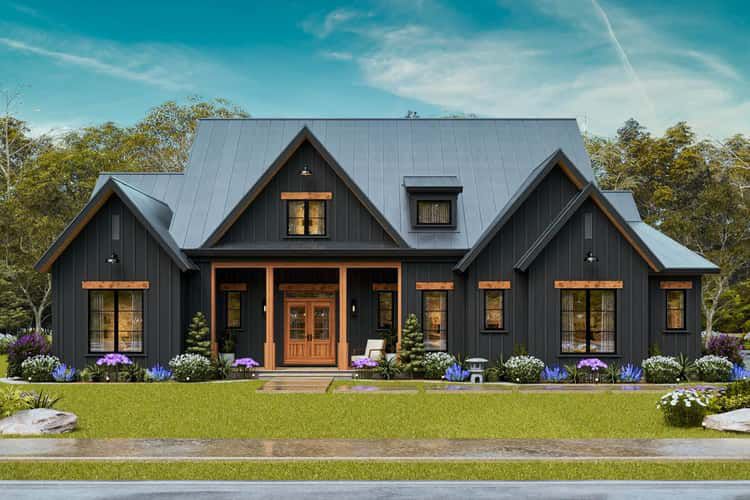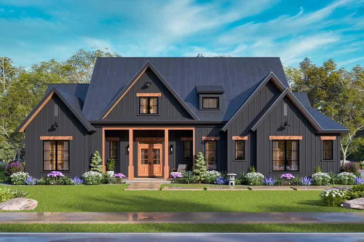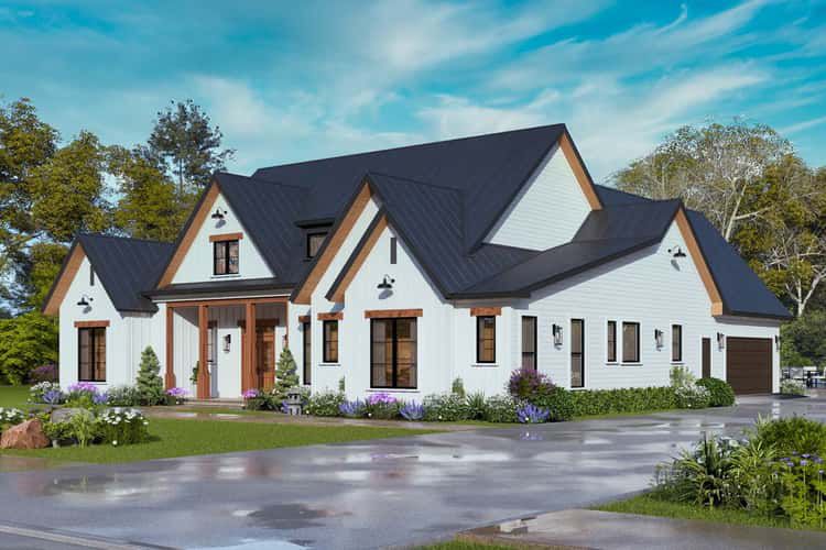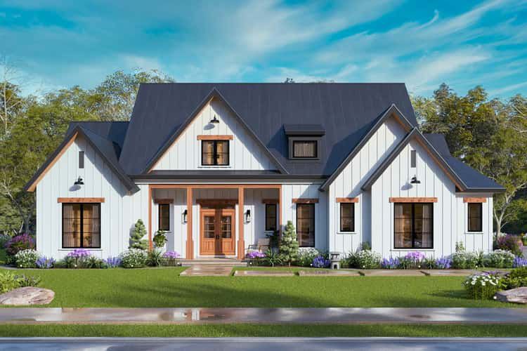 The exterior captures modern farmhouse character with clean lines, a central gable, and a balanced composition of siding, trim, and roof pitches. 1 The welcoming front elevation includes a covered porch, creating a comfortable spot for greeting guests or catching morning light before stepping inside. 2 With its side-entry two-car garage tucked neatly out of direct street view, the facade feels tidy and refined while still maintaining practical access for everyday use. 3