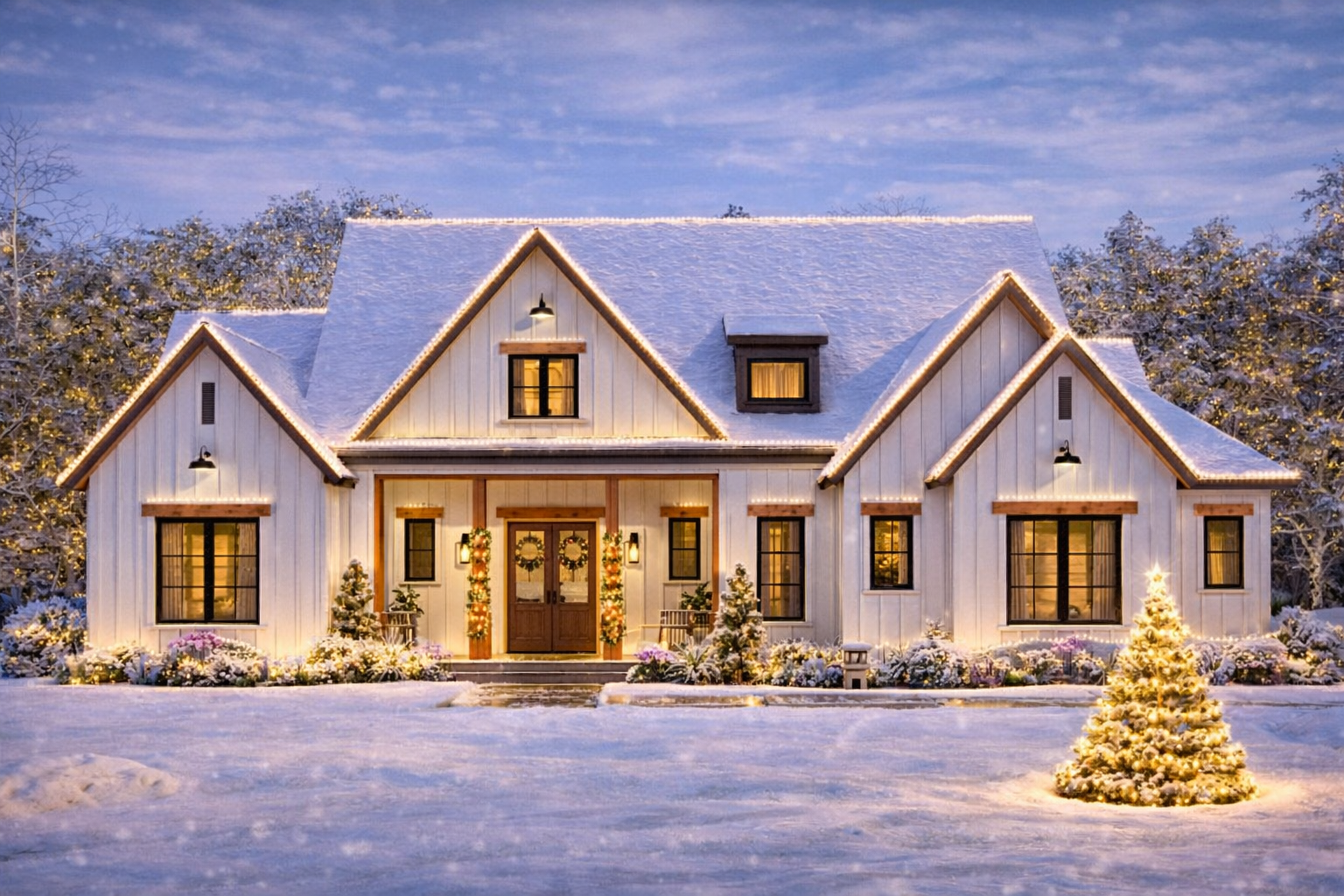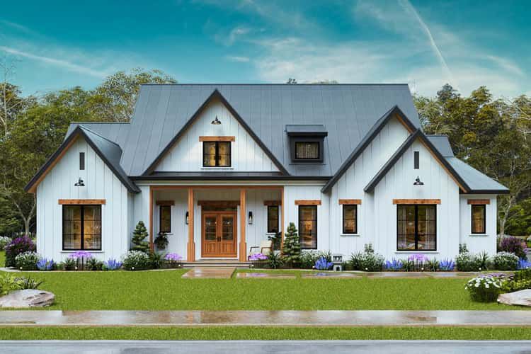 The exterior captures modern farmhouse character with clean lines, a central gable, and a balanced composition of siding, trim, and roof pitches. 1 The welcoming front elevation includes a covered porch, creating a comfortable spot for greeting guests or catching morning light before stepping inside. 2 With its side-entry two-car garage tucked neatly out of direct street view, the facade feels tidy and refined while still maintaining practical access for everyday use. 3