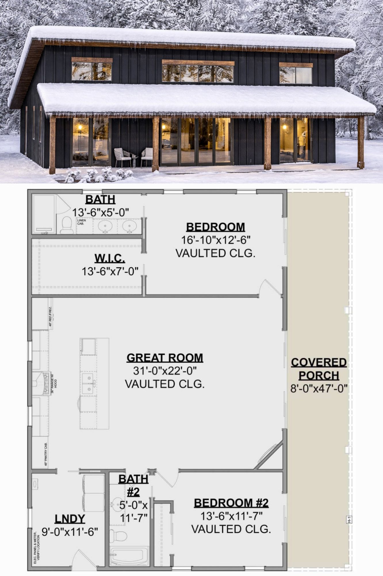 The exterior showcases a modern architectural style with simple lines and a balanced structure. With approximate dimensions of 47 feet wide and 40 feet deep, the home maintains a compact yet practical footprint suitable for various plot sizes. 1