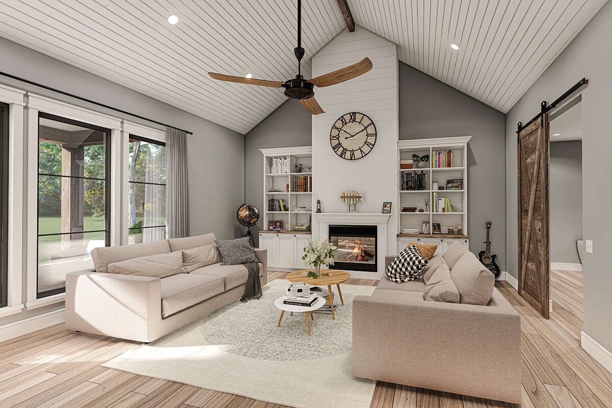The great room serves as the focal point of the home, featuring voluminous ceiling heights and a gas fireplace flanked by built-in cabinetry. 5 Large windows bring in abundant natural light, enhancing the open and airy feel.