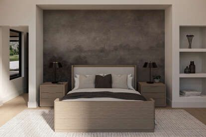Tucked into its own wing of the home, the primary bedroom suite offers a peaceful retreat. 13 Expansive windows let in soft natural light while preserving privacy. 14 The adjoining full bathroom features thoughtful details and generous layout, and a sizable walk-in closet gives plenty of storage without crowding the sleeping area. 15 This space is designed to be a calming sanctuary at the end of the day. 16