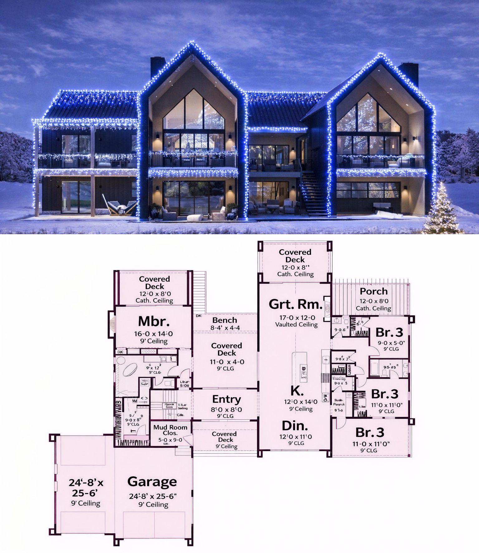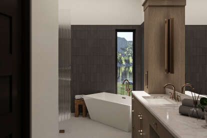 The exterior presents a modern aesthetic with clean lines, expansive windows, and a balanced façade that conveys both strength and elegance. 1 Approximately 103′-4″ wide × 92′ deep, the plan showcases bold horizontal proportions that fit beautifully on larger lots and make a strong architectural statement. 2 A combination of materials and rooflines enhances curb appeal while reinforcing the home’s contemporary character. 3