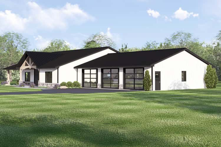 This modern ranch house plan delivers about 2,280 sq ft of beautifully balanced living space on one level, blending sleek contemporary style with practical family living. With 3 bedrooms, 3.5 bathrooms, a large 3-car side-entry garage (~1,584 sq ft), and thoughtful spaces that support both everyday comfort and entertaining, this home brings together modern layout flexibility and timeless ranch ease. It’s designed for those who want open interior flow, outdoor connection, and distinct private wings without compromising style. 0