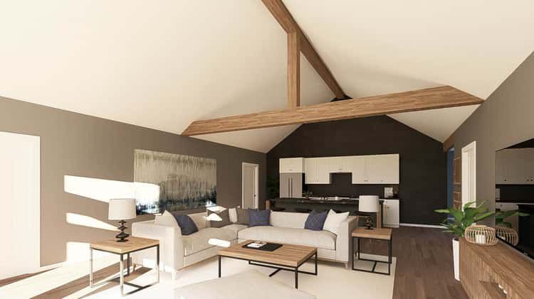 The exterior combines clean modern lines with warm touches that make this ranch feel both stylish and inviting. 1 Stone accents, thoughtful material variation, and generous windows lend depth and character to the façade, while a covered entry defined by a timber truss adds a sense of welcome. 2 The substantial three-car garage sits neatly to the side, keeping the front elevation balanced and maintaining a strong curb presence. 3