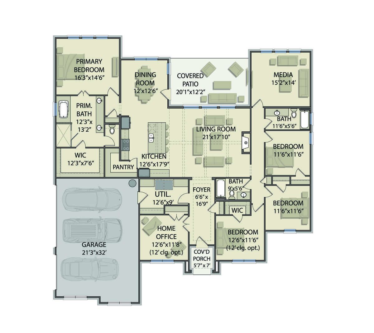 The layout allows for outdoor living areas such as patios or porches, extending the living space and creating opportunities for relaxation and entertainment.