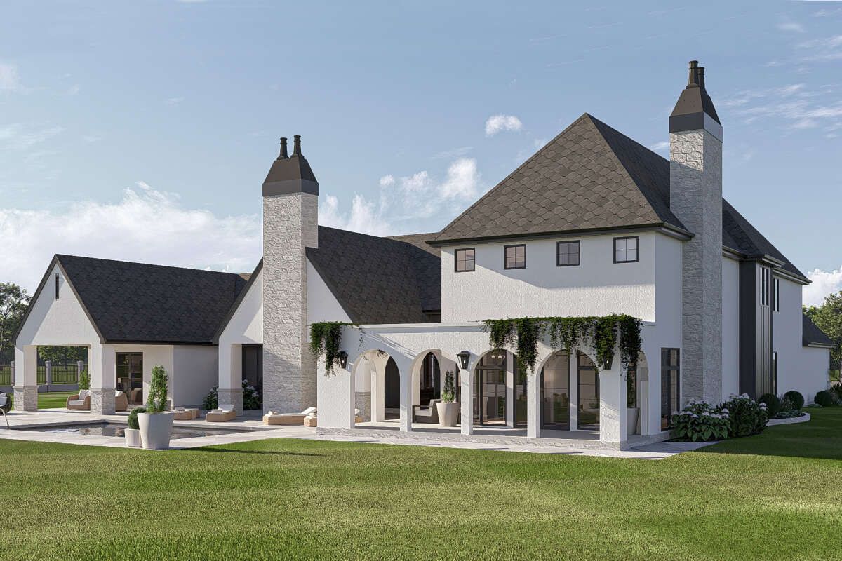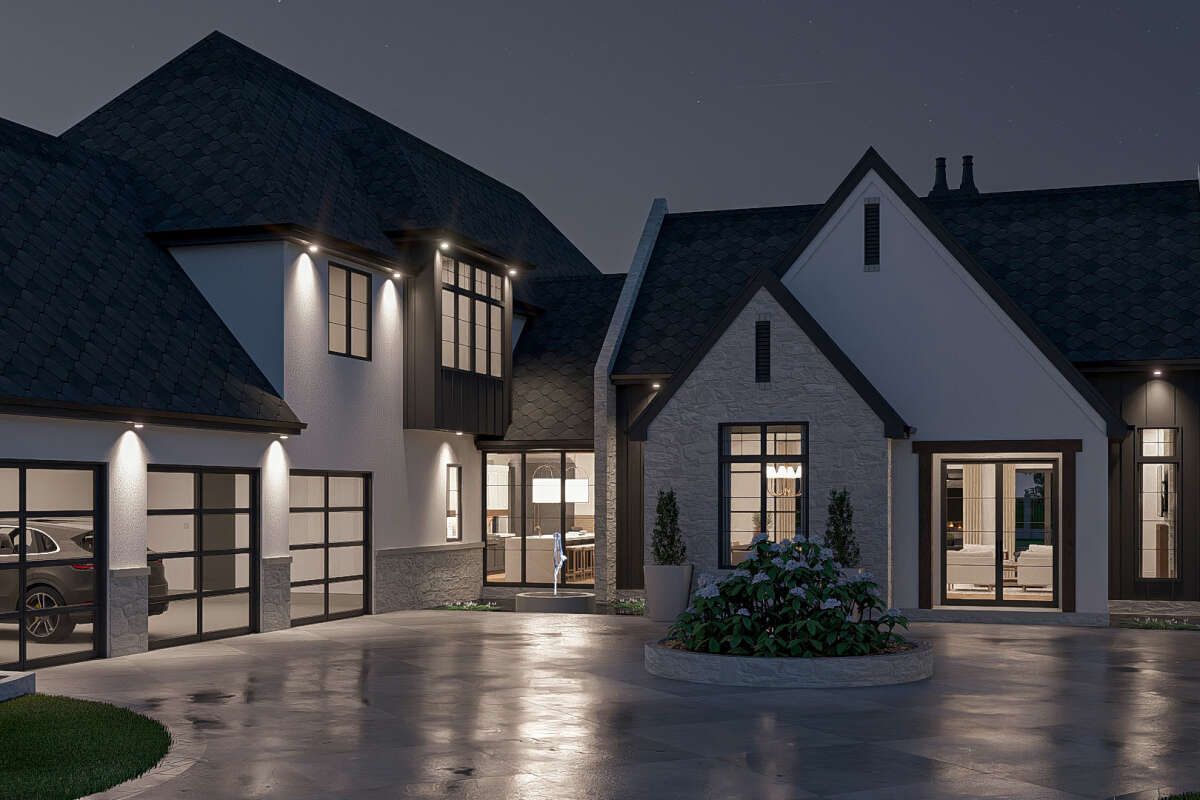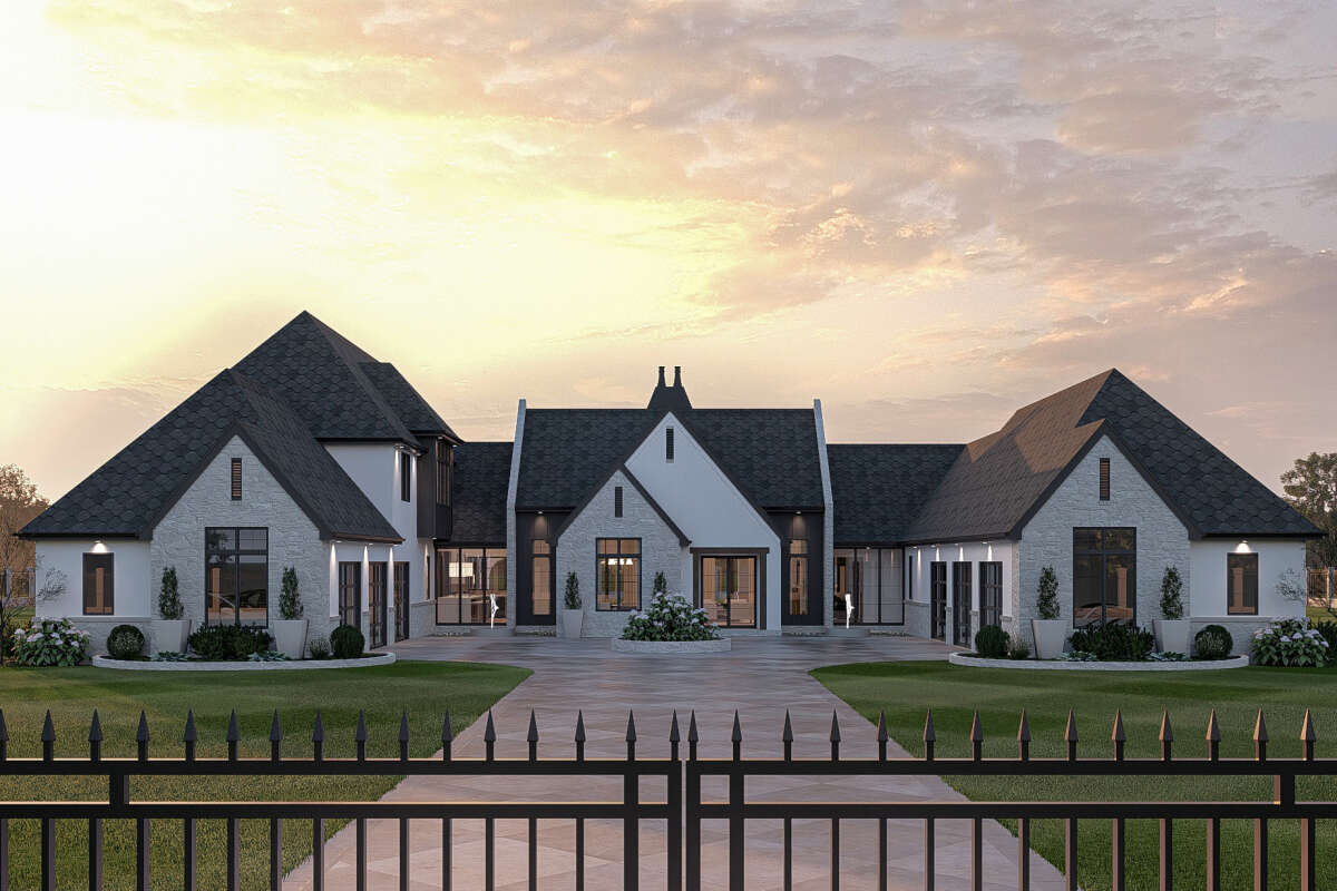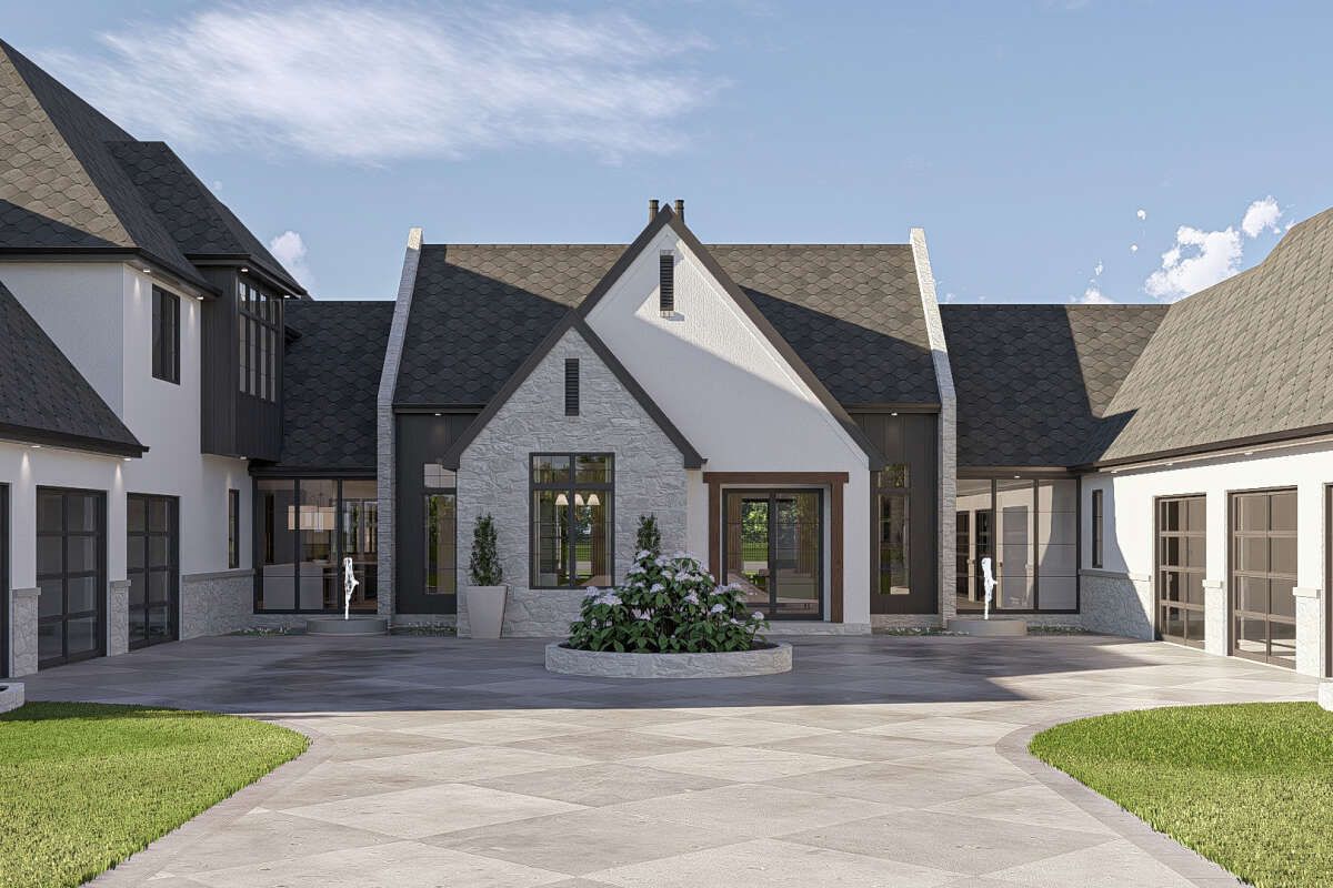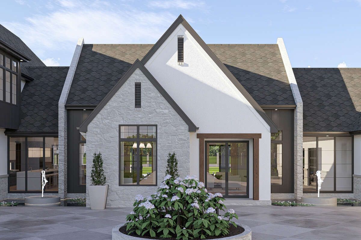 This home greets you with a striking modern transitional façade that balances clean contemporary lines with classic proportions. 1 The wide footprint (about 102′-8″) and deep plan (~111′-4″) create a strong street presence and invite exploration of the layers of architecture. 2 A covered front porch enhances curb appeal while offering a welcoming outdoor transition that feels both cozy and refined. 3