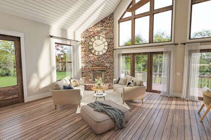 This mountain house plan emphasizes an open, flowing interior that balances shared living areas with private retreats. The 1.5-story layout provides efficient use of square footage, creating distinct zones for daily life while maximizing interior volume and architectural character. 3