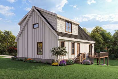 Exterior finishes typically combine horizontal and vertical siding options with natural materials like wood or stone accents for a cozy, lodge-like feel. Covered entries or small porch areas enhance the home’s connection to outdoor living. 2