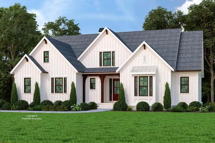 Tis New American farmhouse plan delivers roughly 2,710 sq ft of thoughtfully organized living space that marries traditional farmhouse charm with modern lifestyle needs. Featuring 4 bedrooms, 3 full bathrooms, an open family room with soaring vaulted ceilings, and a layout designed to support both daily living and entertaining, this home offers a warm, functional floor plan for families who value bright, connected spaces and well-defined private zones.