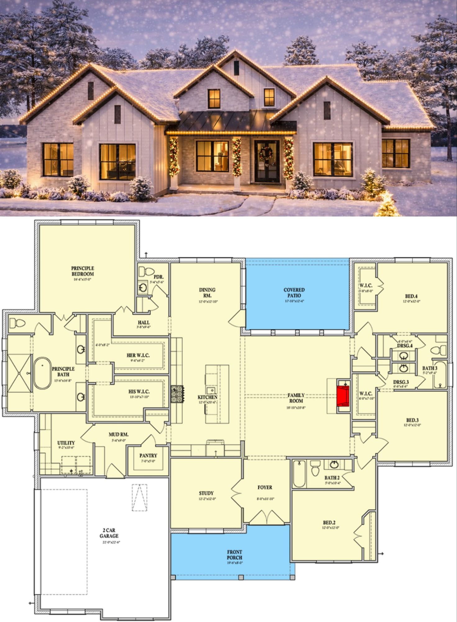 This beautifully arranged New American house plan offers about 3,106 sq ft of heated living space, thoughtfully designed for everyday family life and entertaining. With 4 bedrooms, 3.5 bathrooms, a dedicated study, an inviting open living core, and generous outdoor living spaces—including a covered patio that broadens your usable living area—this home combines classic residential comfort with modern layout efficiencies. 0