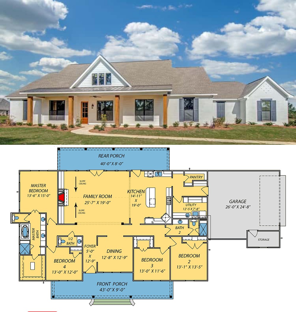 This inviting one-level country-style home delivers approximately 2,677 sq ft of living space — ideal for families seeking comfort, practicality, and laid-back country charm. The plan includes 4 bedrooms, 2.5 bathrooms, and thoughtful design features like a wide covered porch, a well-equipped kitchen with walk-in pantry and large island, and a layout that separates bedrooms for privacy and flexibility. 0