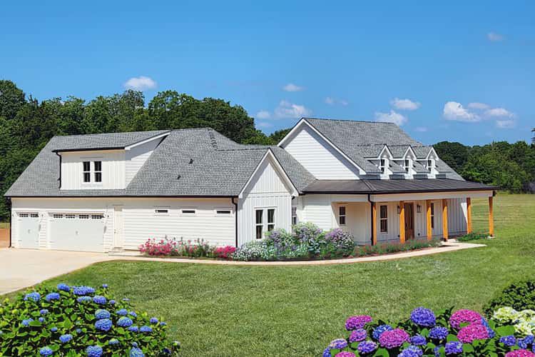 The exterior greets you with classic farmhouse character: three dormer windows crowning the covered front porch create a welcoming, symmetrical façade that fits beautifully on many lot sizes. 0 A side-entry 2-car garage keeps the front uncluttered, while the house’s proportions — about 75′ 3″ wide × 70′ 4″ deep with a roof ridge reaching up to ~25′ 7″ — give it a grounded, substantial presence without feeling oversized. 1