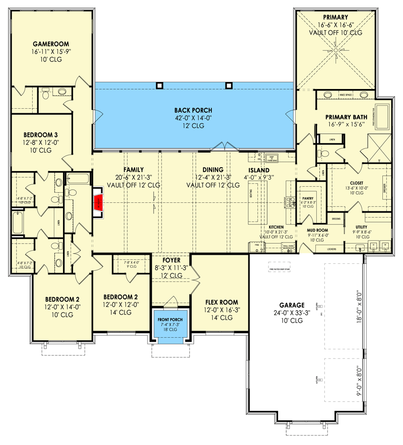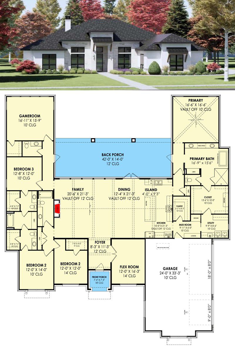 - Design Features: Split-bed layout, vaulted great room, fireplace, island kitchen + walk-in pantry, flex room, game/rec room, mudroom, side-entry garage, large windows for natural light. 23
