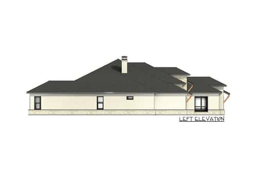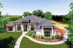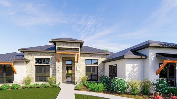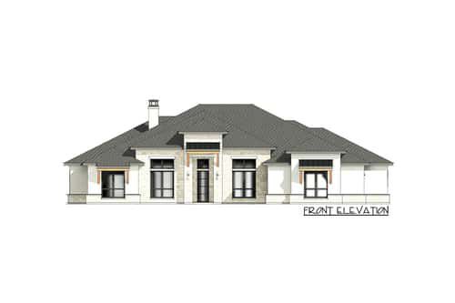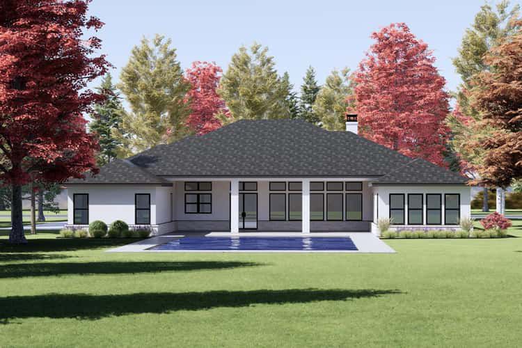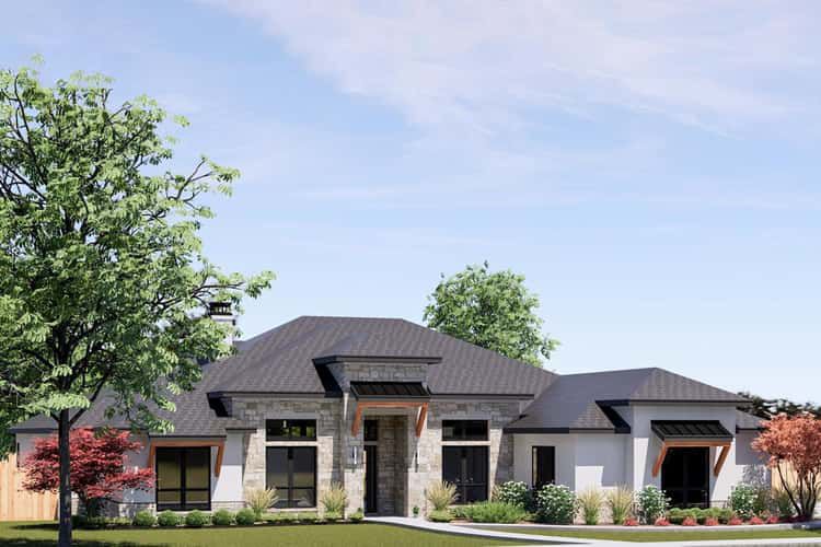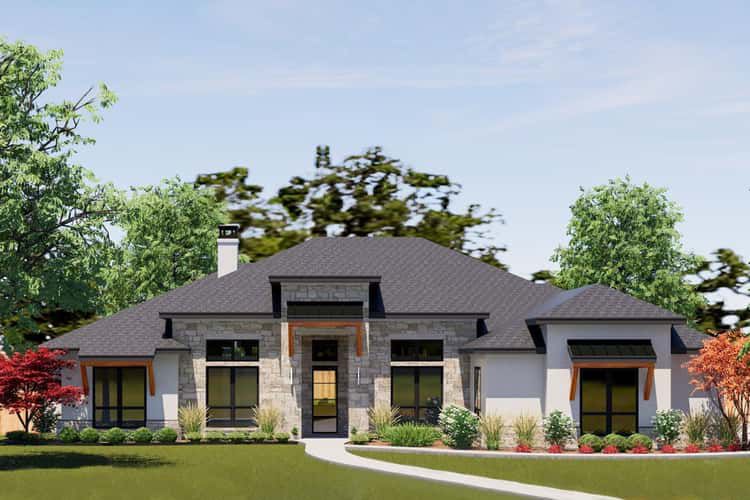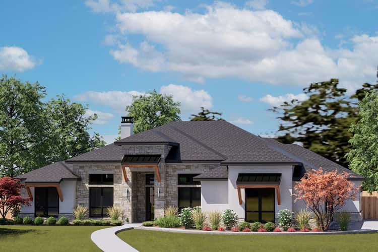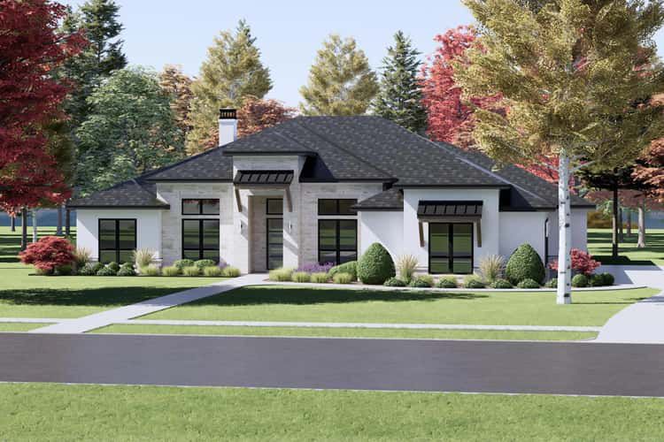 The home spans roughly 81′ 11″ wide × 88′ 3″ deep, with a roof pitch of 6:12 and a maximum ridge height near 25′ — giving it a substantial, grounded presence without being overly tall. 1 The 3-car side-entry garage keeps the facade balanced and residential, while the overall silhouette and proportions suit a wide lot and convey a sense of stability and classic ranch-style charm. 2